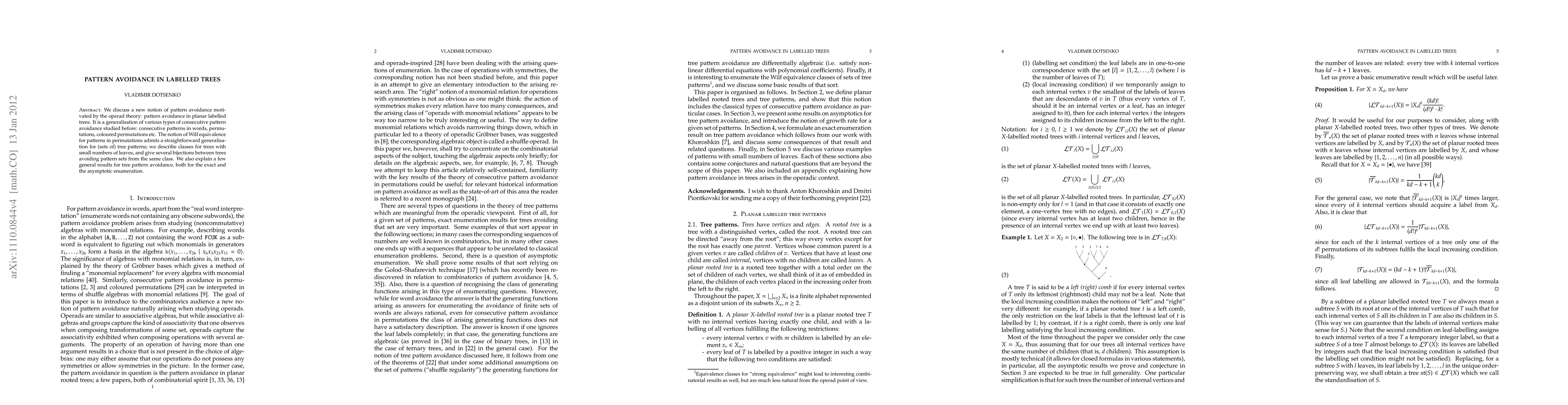 We discuss a new notion of pattern avoidance motivated by the operad theory: pattern avoidance in planar labelled trees. It is a generalisation of various types of consecutive pattern avoidance studied before: consecutive patterns in words, permutations, coloured permutations etc. The notion of Wilf equivalence for patterns in permutations admits a straightforward generalisation for (sets of) tree patterns; we describe classes for trees with small numbers of leaves, and give several bijections between trees avoiding pattern sets from the same class. We also explain a few general results for tree pattern avoidance, both for the exact and the asymptotic enumeration.