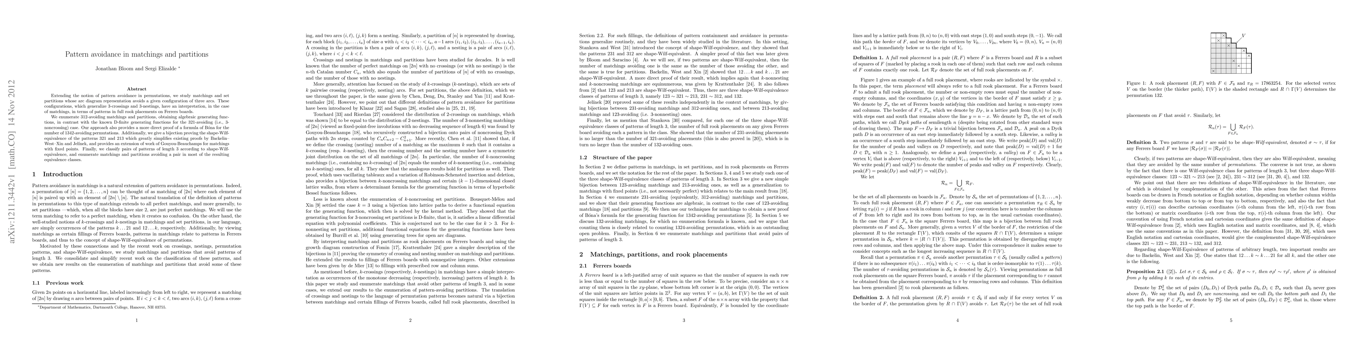 This paper studies pattern avoidance in matchings and partitions, focusing on configurations that avoid specific arc diagram representations. It enumerates 312-avoiding matchings and partitions, deriving algebraic generating functions, and provides a new proof for B\'ona's formula on 1342-avoiding permutations, along with a simplified bijection for shape-Wilf-equivalence of patterns 321 and 213.