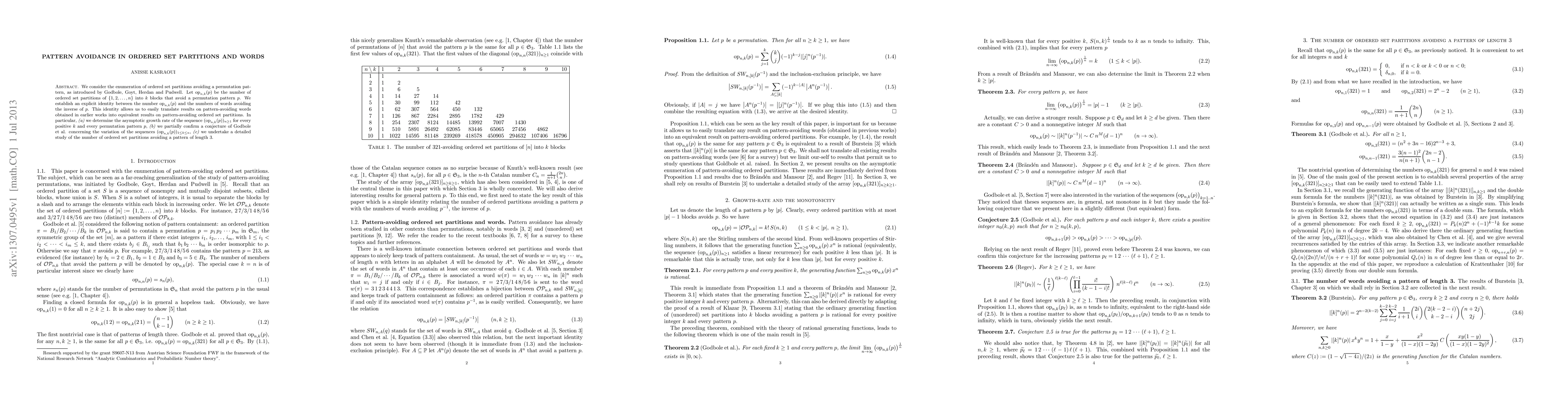 This paper establishes an explicit identity between ordered set partitions that avoid a permutation pattern and words that avoid the inverse of that pattern, enabling the translation of known word results into partition results. The study determines the asymptotic growth rate of such partitions, confirms a conjecture on sequence variation, and examines partitions avoiding patterns of length 3 in detail.