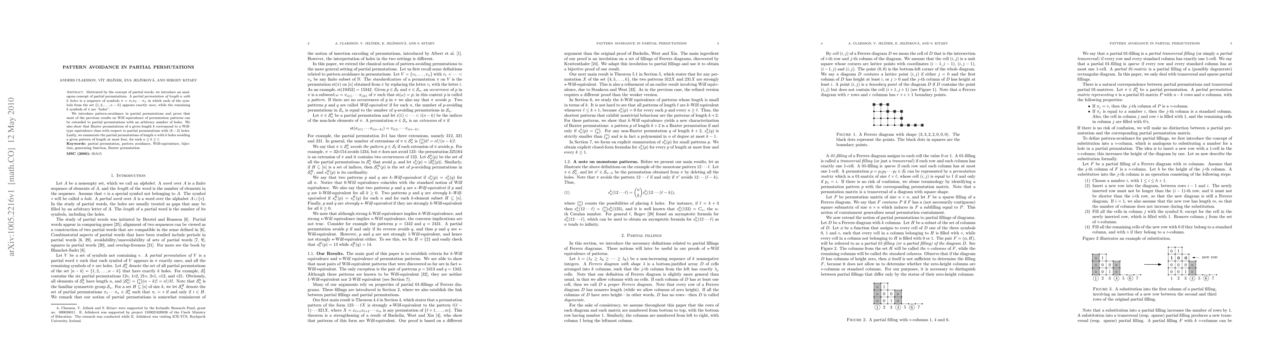 Summary: This paper explores pattern avoidance in partial permutations, extending results on permutation patterns to sequences with holes. It establishes Wilf equivalence for partial permutations and enumerates patterns of length four or less for specific cases.