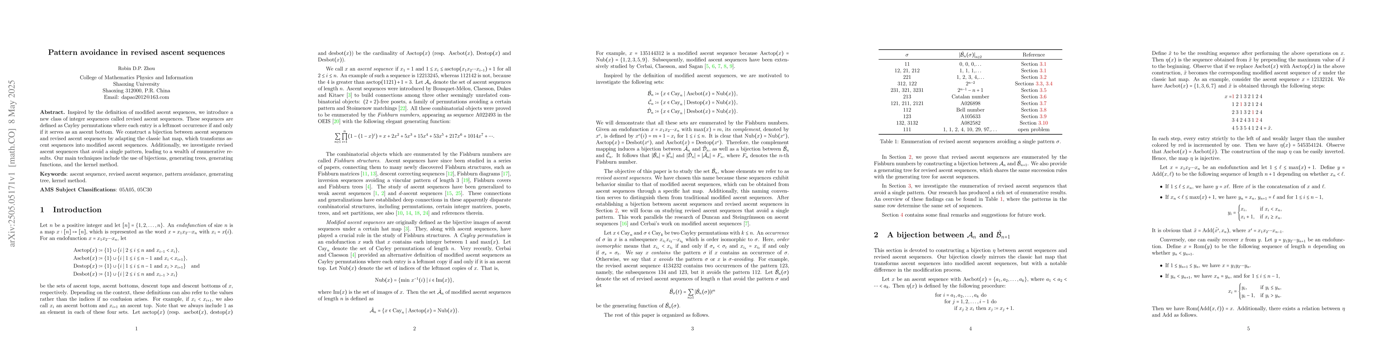Researchers introduce a new class of integer sequences called revised ascent sequences, which are linked to traditional ascent sequences through a bijection, enabling the study of patterns within these sequences.