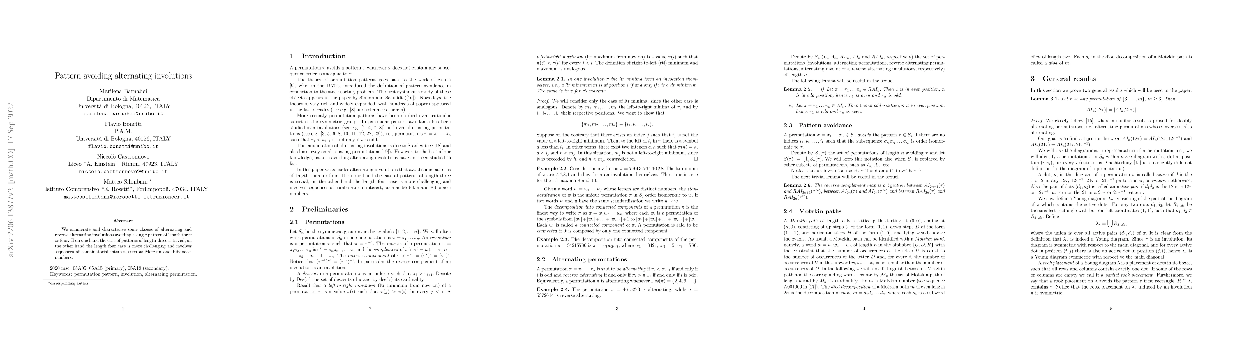 This paper enumerates and characterizes classes of alternating and reverse alternating involutions that avoid specific patterns of length three or four. While pattern avoidance for length three is straightforward, the more complex length four patterns involve notable combinatorial sequences like Motzkin and Fibonacci numbers.