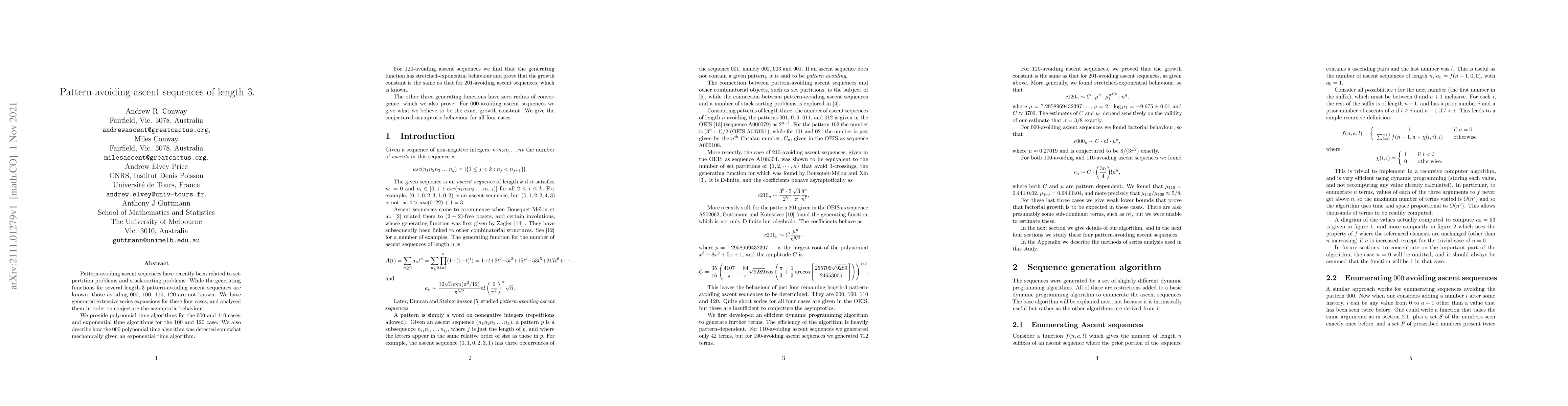 This research investigates the generating functions and asymptotic behaviors of pattern-avoiding ascent sequences of length 3, specifically for sequences avoiding the patterns 000, 100, 110, and 120. It presents polynomial time algorithms for the 000 and 110 cases and exponential time algorithms for the 100 and 120 cases, with a focus on the latter's stretched-exponential behavior.