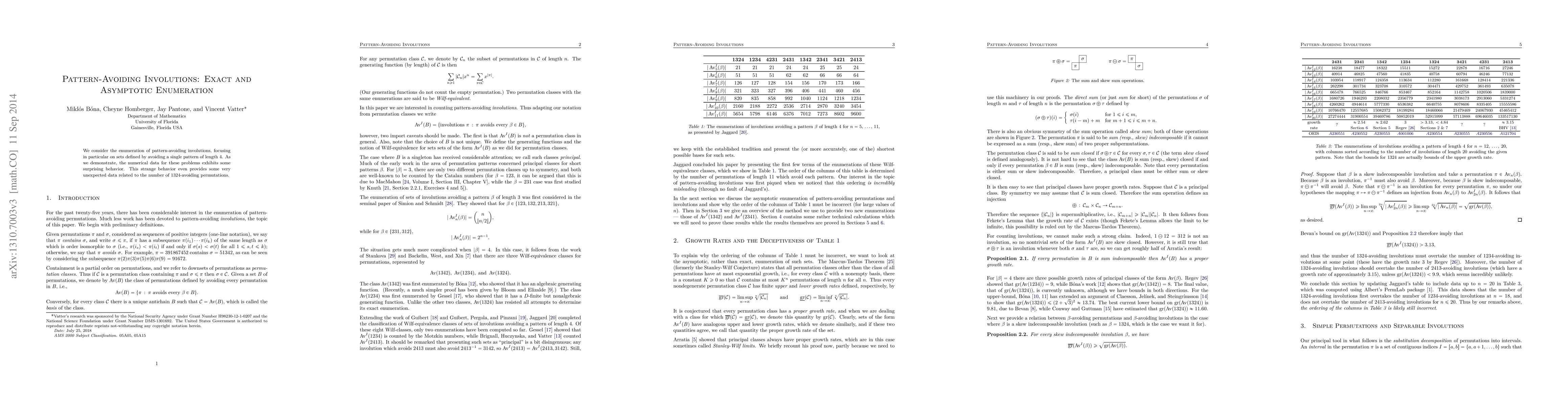 This paper explores the enumeration of pattern-avoiding involutions, specifically those avoiding a single 4-length pattern, revealing unexpected numerical behaviors and surprising connections to the count of 1324-avoiding permutations.