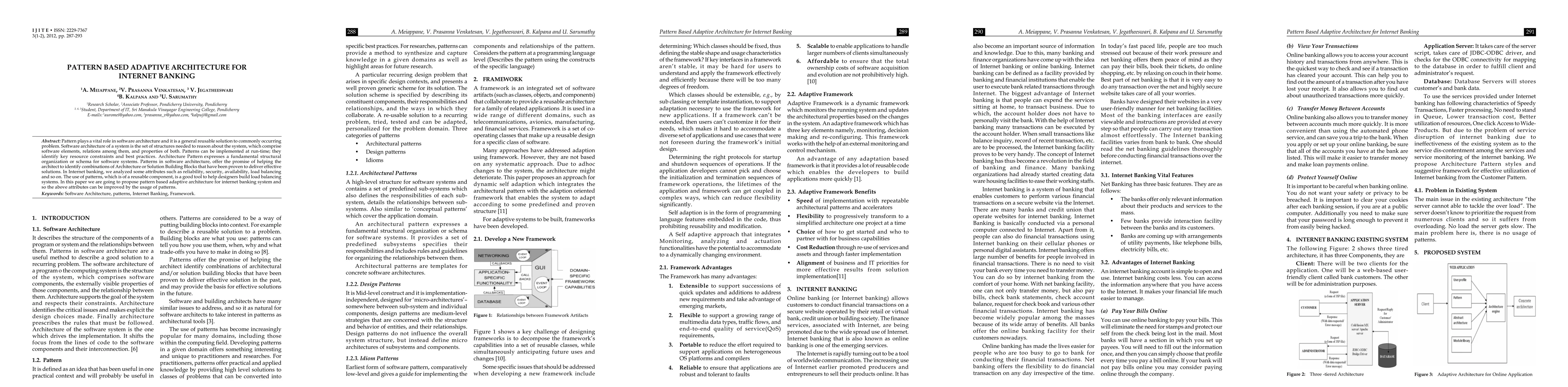 This paper proposes a pattern-based adaptive architecture for internet banking systems to enhance attributes like reliability, security, availability, and load balancing. By leveraging reusable architectural patterns, the design aims to deliver effective and adaptive solutions to common challenges in internet banking.