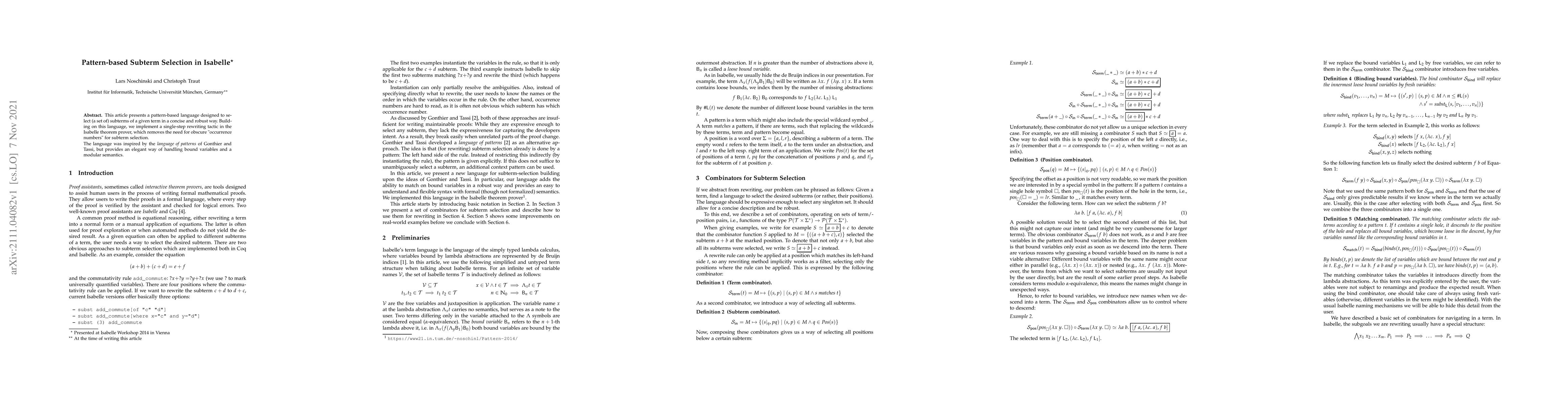 This paper introduces a pattern-based language for selecting subterms in Isabelle, eliminating the need for occurrence numbers. It offers a robust and concise method for subterm selection, inspired by Gonthier and Tassi's language of patterns, with enhanced handling of bound variables and modular semantics.