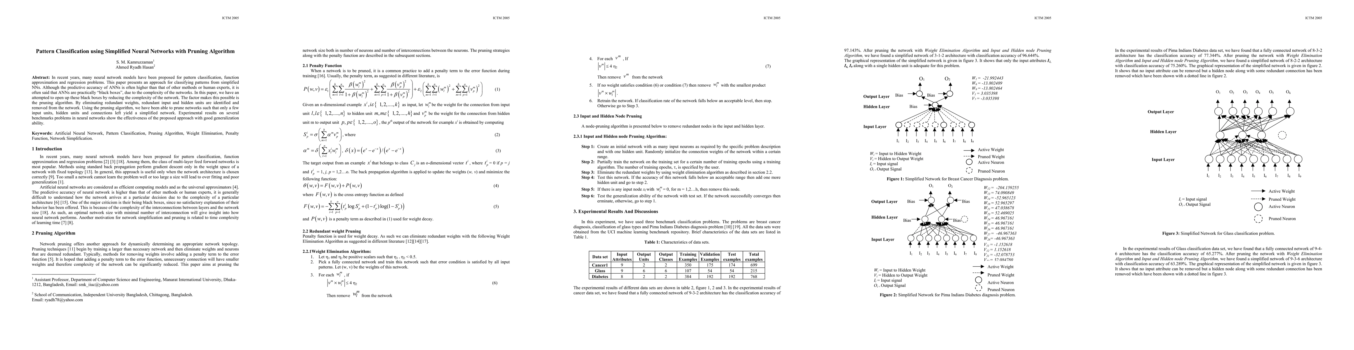 In recent years, many neural network models have been proposed for pattern classification, function approximation and regression problems. This paper presents an approach for classifying patterns from simplified NNs. Although the predictive accuracy of ANNs is often higher than that of other methods or human experts, it is often said that ANNs are practically "black boxes", due to the complexity of the networks. In this paper, we have an attempted to open up these black boxes by reducing the complexity of the network. The factor makes this possible is the pruning algorithm. By eliminating redundant weights, redundant input and hidden units are identified and removed from the network. Using the pruning algorithm, we have been able to prune networks such that only a few input units, hidden units and connections left yield a simplified network. Experimental results on several benchmarks problems in neural networks show the effectiveness of the proposed approach with good generalization ability.
