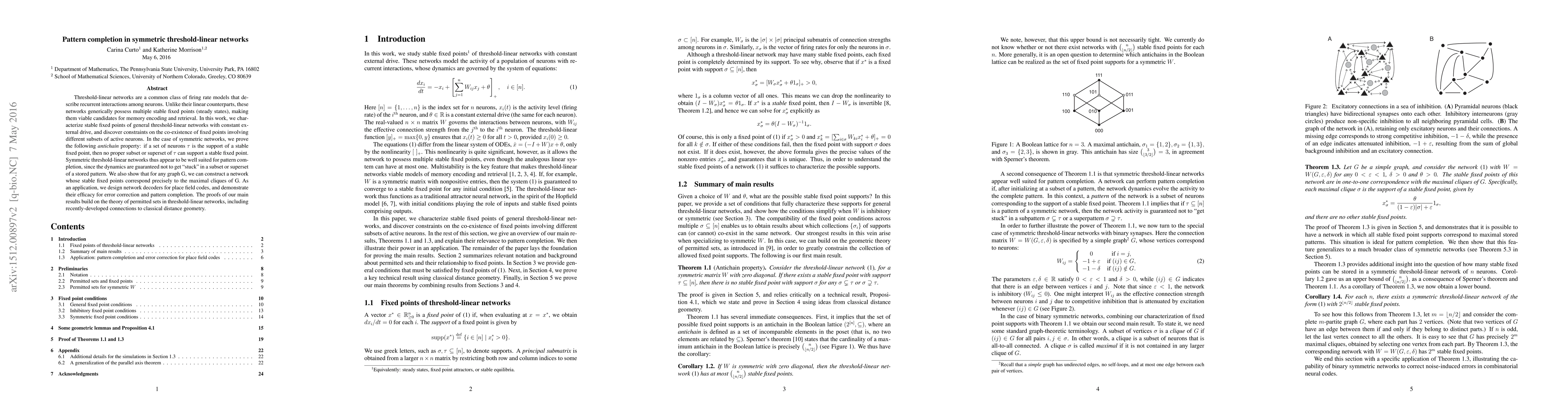 This paper explores stable fixed points in symmetric threshold-linear networks, proving an antichain property that prevents dynamics from getting "stuck" in subsets or supersets of stored patterns, thus facilitating pattern completion. It also constructs networks whose stable fixed points correspond to maximal cliques in a given graph, demonstrating their use in error correction and pattern completion for place field codes.