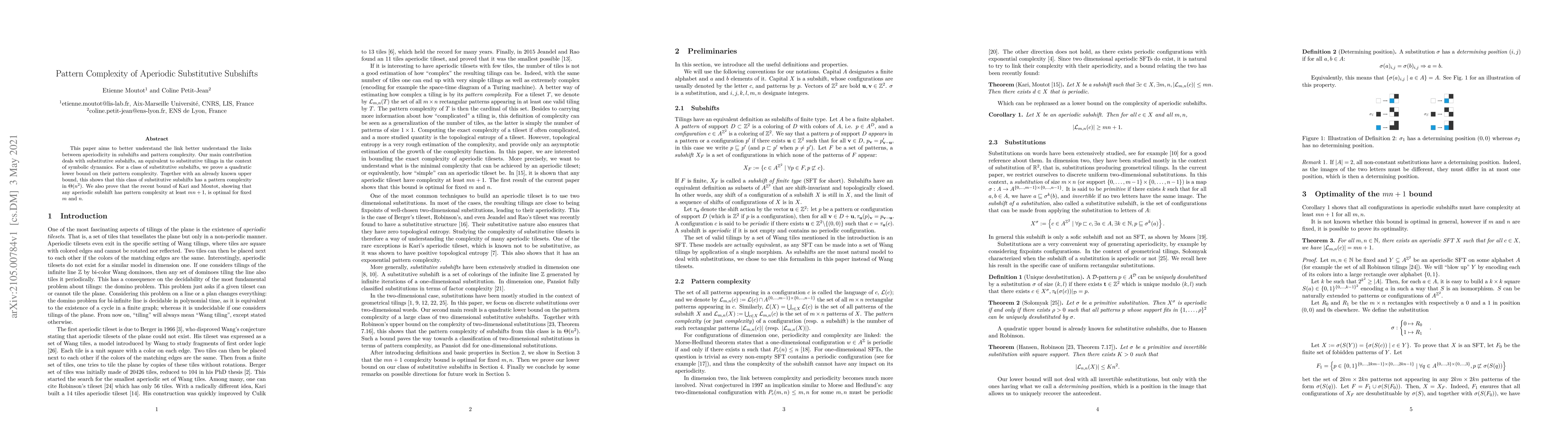 This paper aims to better understand the link better understand the links between aperiodicity in subshifts and pattern complexity. Our main contribution deals with substitutive subshifts, an equivalent to substitutive tilings in the context of symbolic dynamics. For a class of substitutive subshifts, we prove a quadratic lower bound on their pattern complexity. Together with an already known upper bound, this shows that this class of substitutive subshifts has a pattern complexity in $\Theta(n^2)$. We also prove that the recent bound of Kari and Moutot, showing that any aperiodic subshift has pattern complexity at least $mn+1$, is optimal for fixed $m$ and $n$.