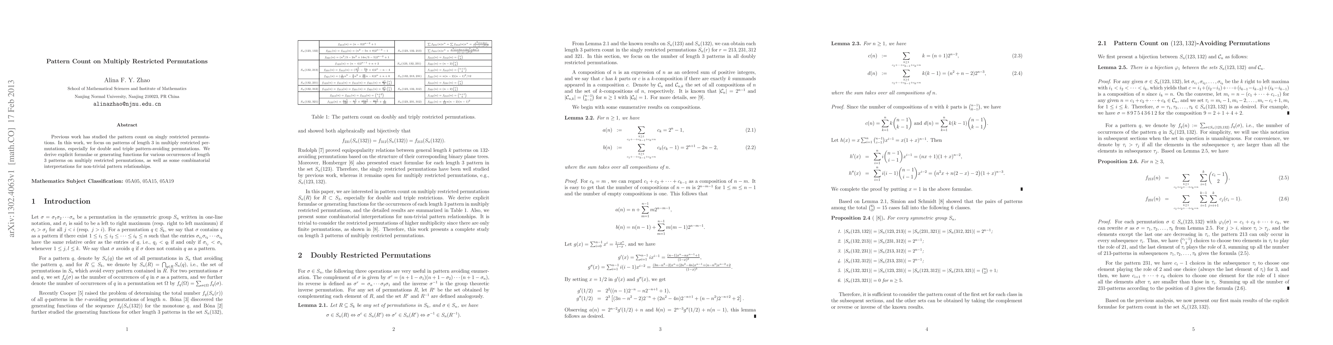 This paper investigates pattern counts for length 3 patterns in multiply restricted permutations, deriving explicit formulae or generating functions for double and triple pattern-avoiding cases, along with combinatorial interpretations of these patterns.