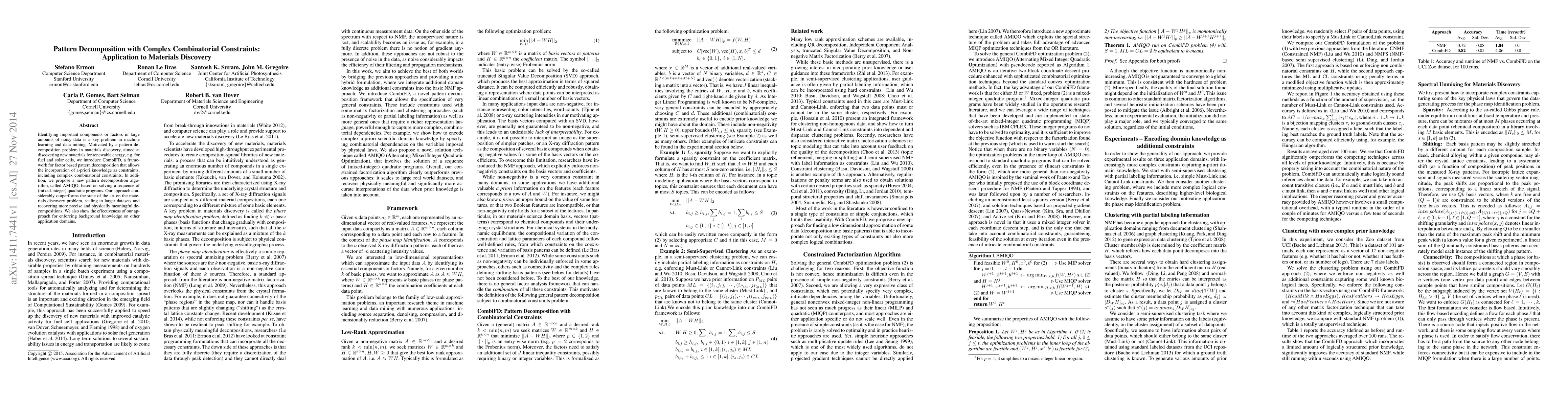 This paper introduces CombiFD, a framework for factor-based pattern decomposition that incorporates complex combinatorial constraints, and proposes AMIQO, an algorithm based on mixed-integer quadratic programming, to identify key components in noisy data for materials discovery, significantly outperforming existing methods. The approach scales well and enforces a-priori knowledge effectively across various domains.