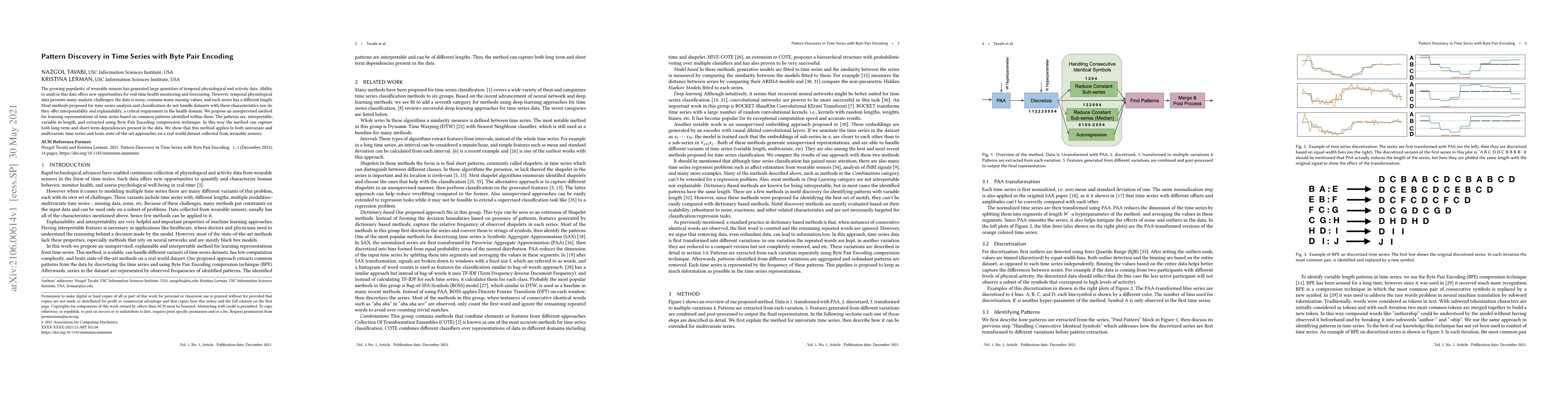 This research introduces an unsupervised method for analyzing temporal physiological data from wearable sensors, addressing challenges like noise, missing values, and varying series lengths. The method uses Byte Pair Encoding to discover interpretable patterns, capturing both short and long-term dependencies, and outperforms existing approaches on real-world datasets.