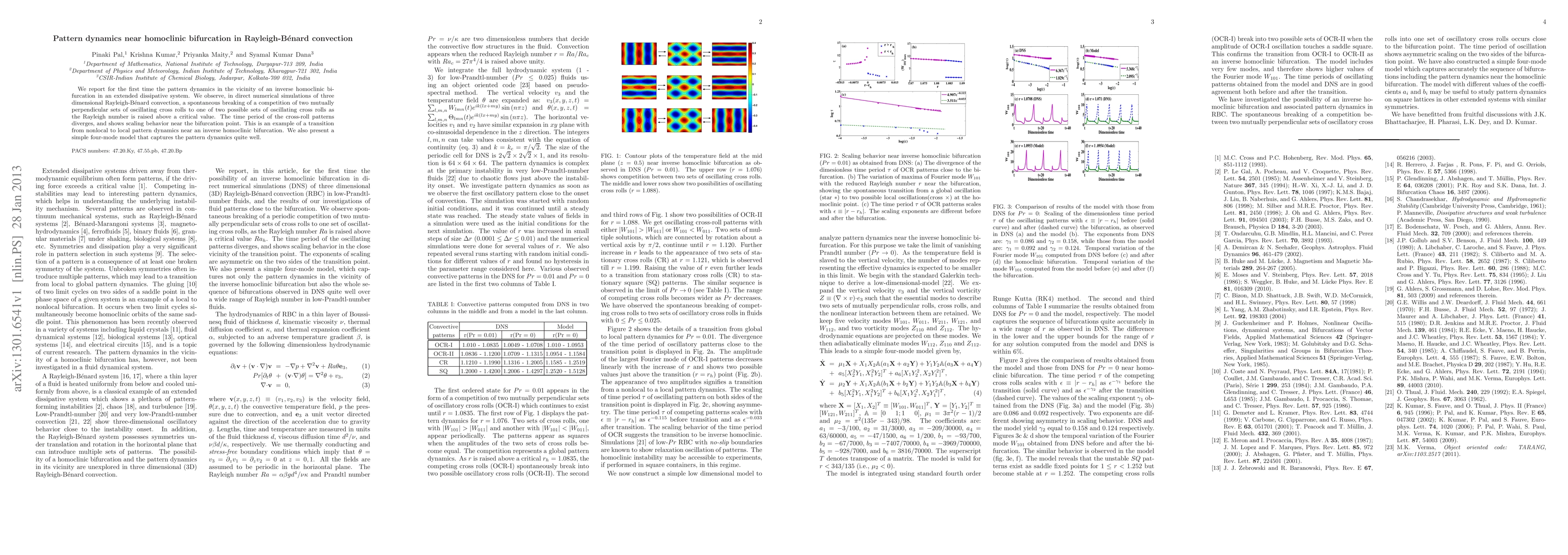 This paper investigates the pattern dynamics near an inverse homoclinic bifurcation in three-dimensional Rayleigh-Bénard convection, revealing a spontaneous selection between two competing sets of oscillating cross rolls. The study uses direct numerical simulations to observe scaling behavior and diverging time periods near the bifurcation point, and proposes a four-mode model for accurate pattern dynamics representation.