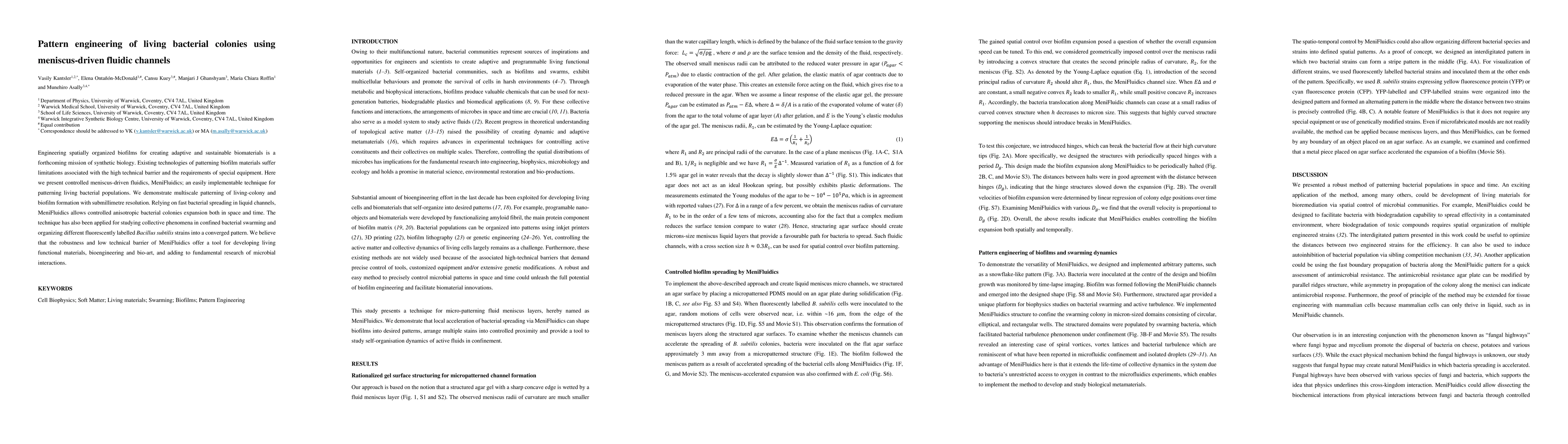 This paper introduces MeniFluidics, a simple technique for patterning living bacterial colonies using meniscus-driven fluidic channels, enabling multiscale biofilm formation with submillimetre precision. The method facilitates studying collective bacterial behaviors and offers a low-barrier tool for synthetic biology and bioengineering.