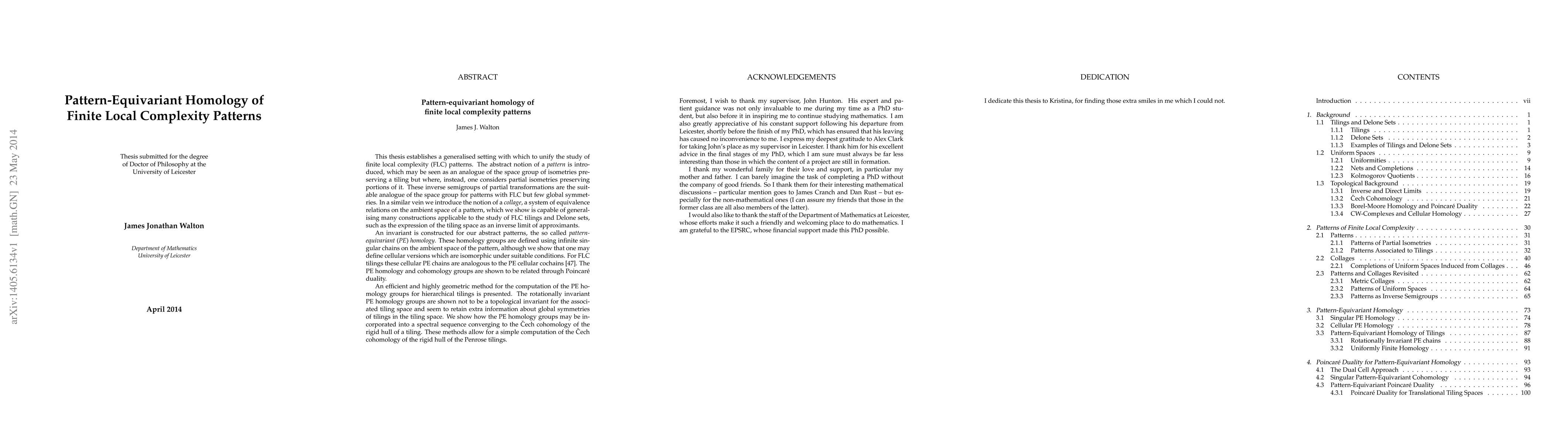 This thesis establishes a generalised setting with which to unify the study of finite local complexity (FLC) patterns. The abstract notion of a "pattern" is introduced, which may be seen as an analogue of the space group of isometries preserving a tiling but where, instead, one considers partial isometries preserving portions of it. These inverse semigroups of partial transformations are the suitable analogue of the space group for patterns with FLC but few global symmetries. In a similar vein we introduce the notion of a \emph{collage}, a system of equivalence relations on the ambient space of a pattern, which we show is capable of generalising many constructions applicable to the study of FLC tilings and Delone sets, such as the expression of the tiling space as an inverse limit of approximants. An invariant is constructed for our abstract patterns, the so called pattern-equivariant (PE) homology. These homology groups are defined using infinite singular chains on the ambient space of the pattern, although we show that one may define cellular versions which are isomorphic under suitable conditions. For FLC tilings these cellular PE chains are analogous to the PE cellular cochains \cite{Sadun1}. The PE homology and cohomology groups are shown to be related through Poincar\'{e} duality. An efficient and highly geometric method for the computation of the PE homology groups for hierarchical tilings is presented. The rotationally invariant PE homology groups are shown not to be a topological invariant for the associated tiling space and seem to retain extra information about global symmetries of tilings in the tiling space. We show how the PE homology groups may be incorporated into a spectral sequence converging to the \v{C}ech cohomology of the rigid hull of a tiling. These methods allow for a simple computation of the \v{C}ech cohomology of the rigid hull of the Penrose tilings.