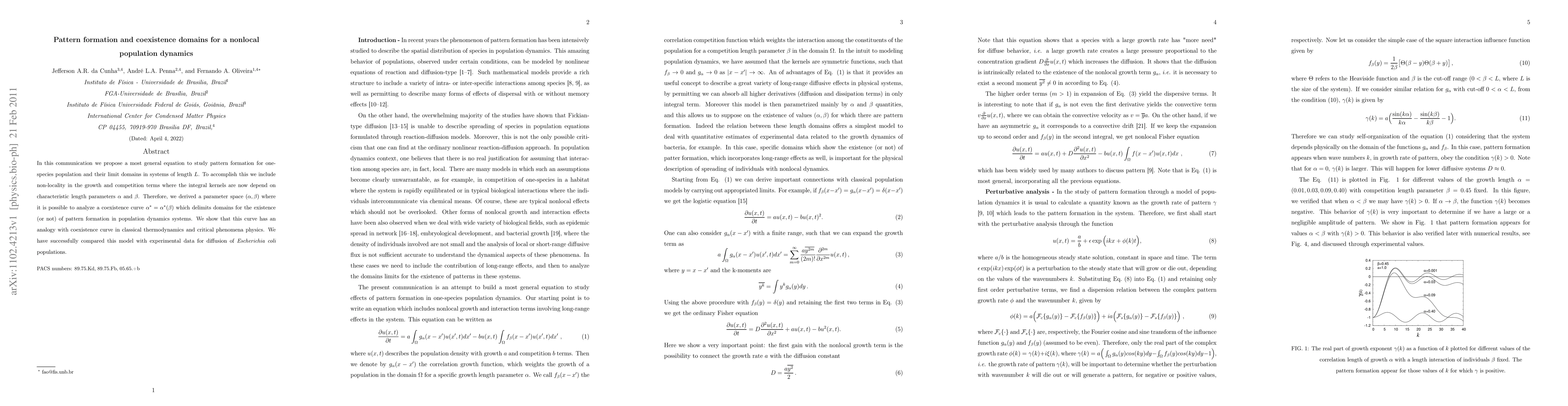 In this communication we propose a most general equation to study pattern formation for one-species population and their limit domains in systems of length L. To accomplish this we include non-locality in the growth and competition terms where the integral kernels are now depend on characteristic length parameters alpha and beta. Therefore, we derived a parameter space (alpha,beta) where it is possible to analyze a coexistence curve alpha*=alpha*(\beta) which delimits domains for the existence (or not) of pattern formation in population dynamics systems. We show that this curve has an analogy with coexistence curve in classical thermodynamics and critical phenomena physics. We have successfully compared this model with experimental data for diffusion of Escherichia coli populations.