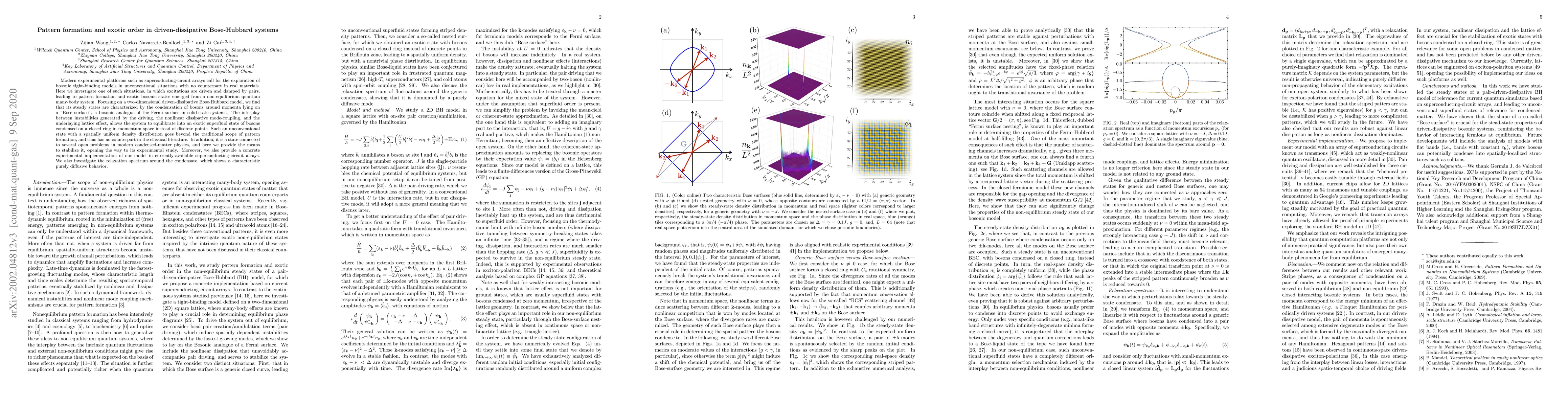 Modern experimental platforms such as supercoducting-circuit arrays call for the exploration of bosonic tight-binding models in unconventional situations with no counterpart in real materials. Here we investigate one of such situations, in which excitations are driven and damped by pairs, leading to pattern formation and exotic bosonic states emerged from a non-equilibrium quantum many-body system. Focusing on a two-dimensional driven-dissipative Bose-Hubbard model, we find that its steady states are characterized by the condensation of bosons around momenta lying on a "Bose surface", a bosonic analogue of the Fermi surface in solid-state systems. The interplay between instabilities generated by the driving, the nonlinear dissipative mode-coupling, and the underlaying lattice effect, allows the system to equilibrate into an exotic superfluid state of bosons condensed on a closed ring in momentum space instead of discrete points. Such an unconventional state with a spatially uniform density distribution goes beyond the traditional scope of pattern formation, and thus has no counterpart in the classical literature. In addition, it is a state connected to several open problems in modern condensed-matter physics, and here we provide the means to stabilize it, opening the way to its experimental study. Moreover, we also provide a concrete experimental implementation of our model in currently-available superconducting-circuit arrays. We also investigate the relaxation spectrum around the condensate, which shows a characteristic purely diffusive behavior.