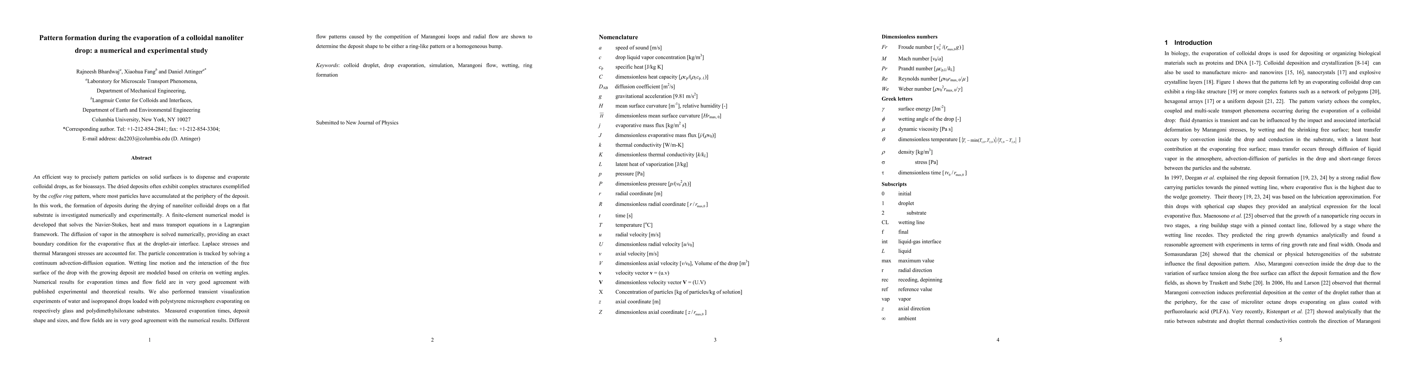 This study numerically and experimentally investigates the pattern formation during the evaporation of colloidal nanoliter drops, focusing on the formation of complex structures like the coffee ring effect. A finite-element model accurately simulates the drying process, capturing the interplay of Marangoni and Laplace stresses, and matches well with experimental observations of polystyrene microsphere deposits on various substrates.