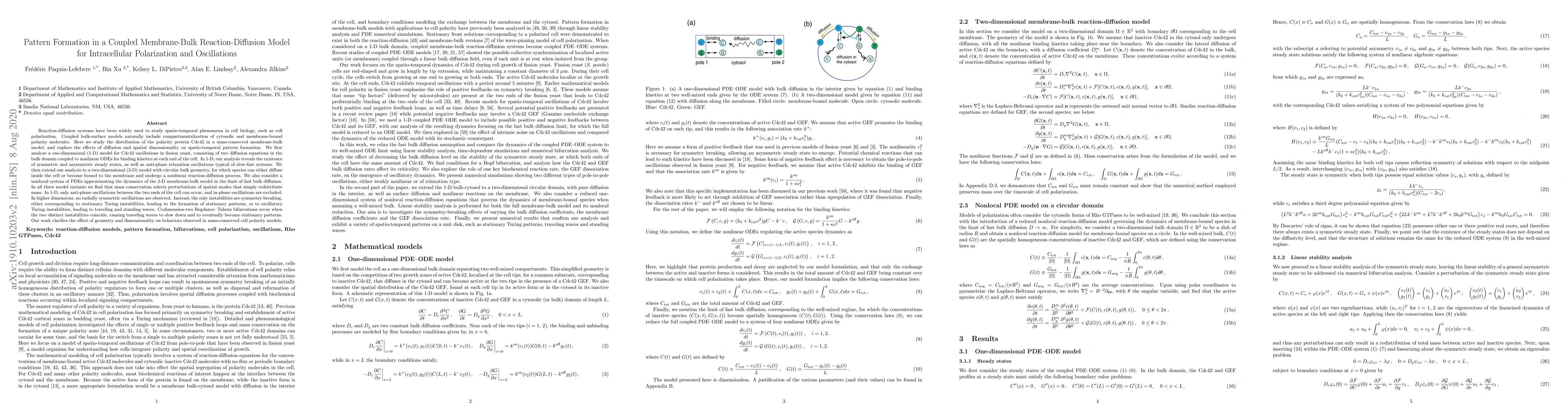 This paper investigates the spatio-temporal pattern formation in a coupled membrane-bulk reaction-diffusion model for intracellular polarization, focusing on the distribution of the polarity protein Cdc42. It reveals distinct dynamical behaviors in 1-D and 2-D models, including anti-phase oscillations in 1-D and symmetry-breaking instabilities leading to stationary or traveling waves in 2-D.