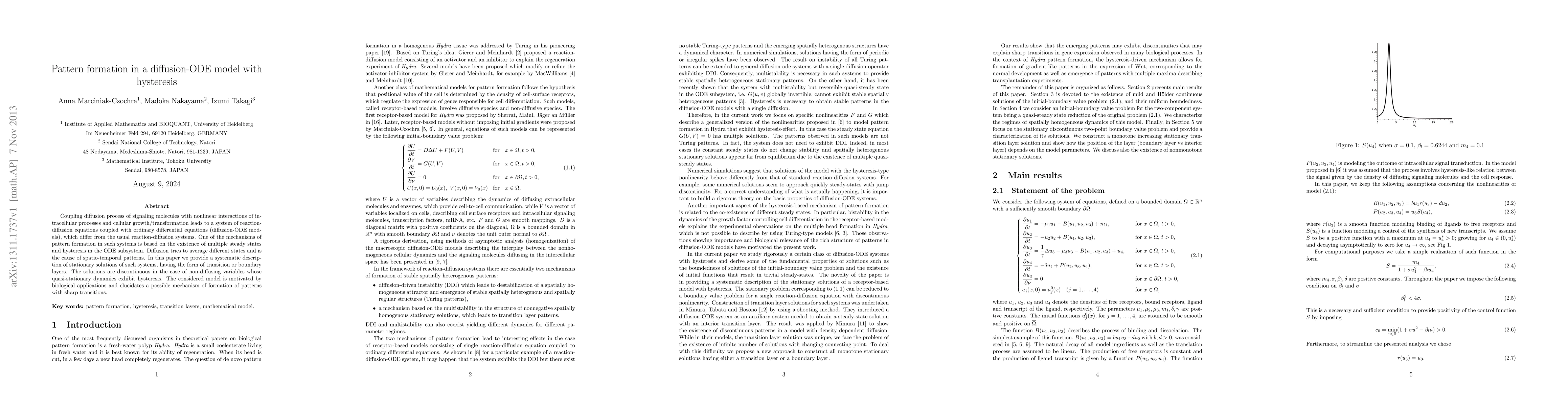 The paper presents a systematic description of stationary solutions of diffusion-ODE models, focusing on systems with multiple steady states and hysteresis in the ODE subsystem, which lead to spatio-temporal patterns.