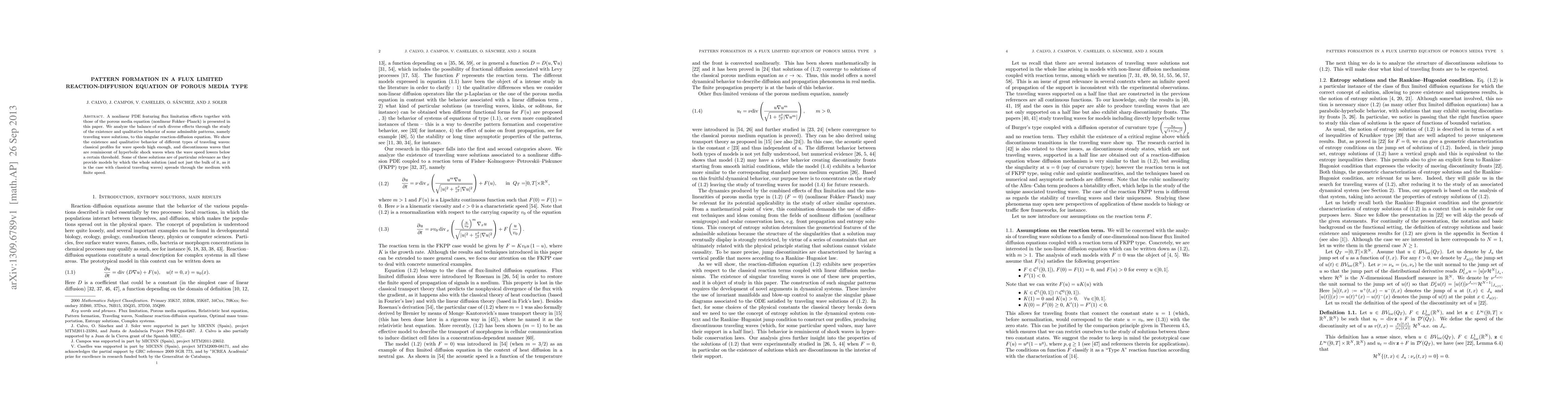 This paper investigates the formation of patterns in a reaction-diffusion equation with flux limitation effects in porous media, showing the existence and behavior of various traveling wave solutions.