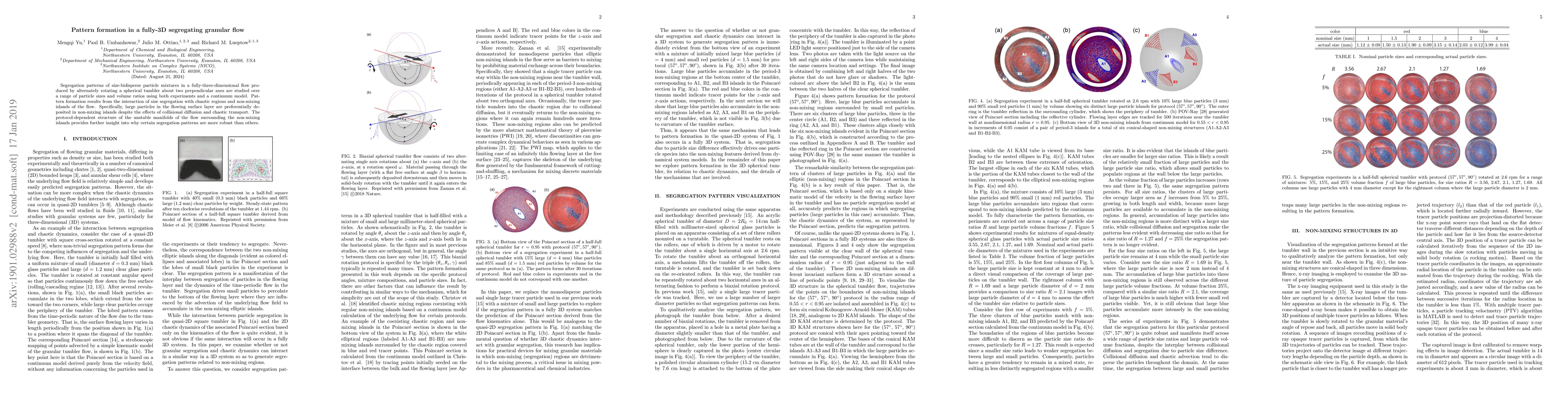 This paper investigates the segregation patterns of size-bidisperse granular mixtures in a fully-3D tumbler flow, revealing that large particles preferentially accumulate in non-mixing flow regions, despite collisional diffusion, and explores the protocol-dependent flow structures that influence pattern robustness.