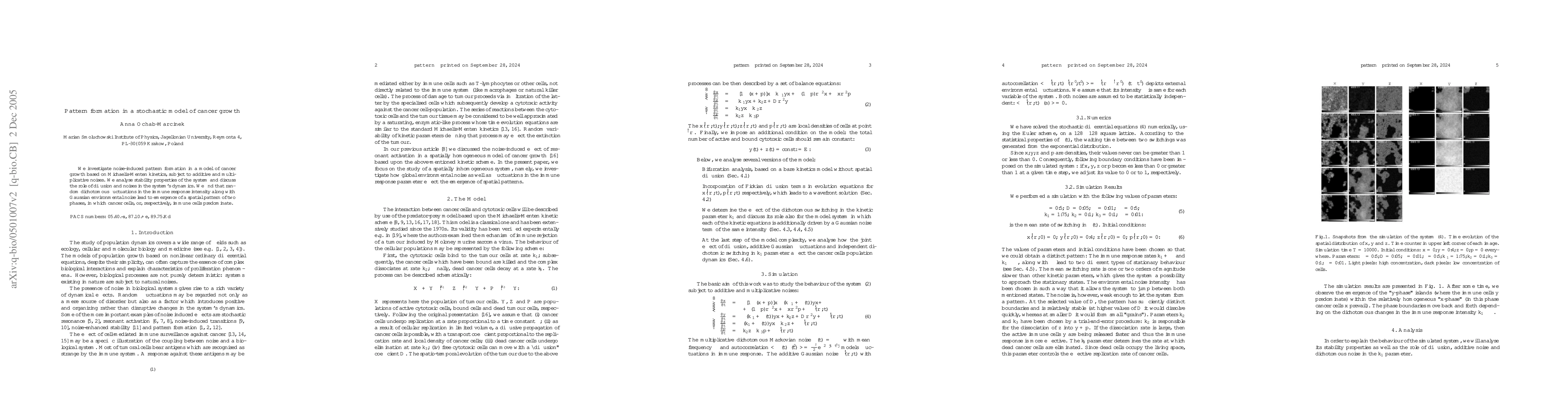 A stochastic model of cancer growth reveals that random fluctuations in immune response intensity lead to the emergence of a spatial pattern with two phases, where cancer cells or immune cells dominate. The study highlights the role of diffusion and noise in shaping the system's dynamics.