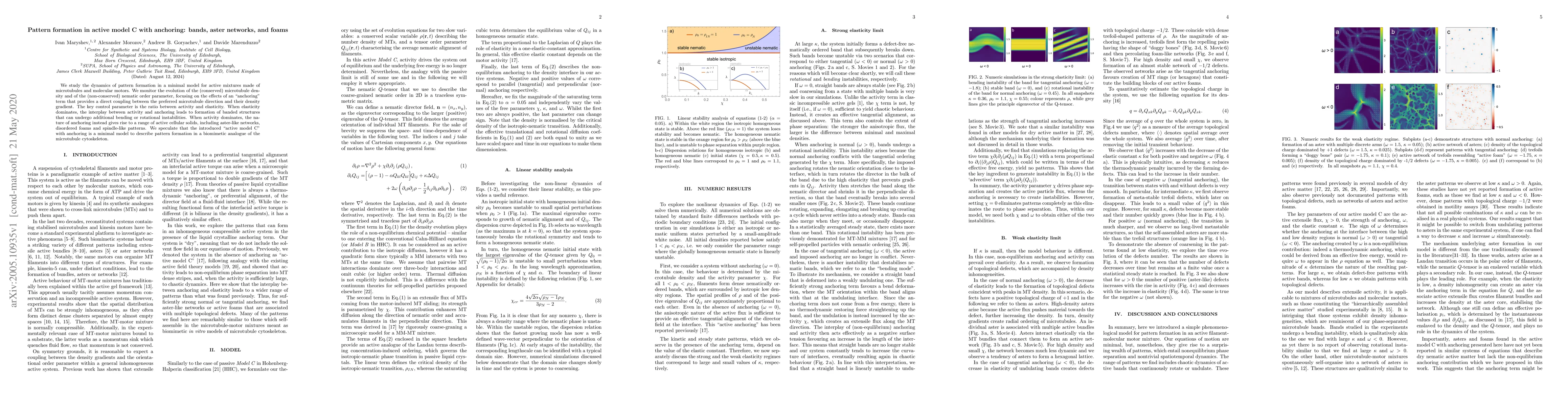 We study the dynamics of pattern formation in a minimal model for active mixtures made of microtubules and molecular motors. We monitor the evolution of the (conserved) microtubule density and of the (non-conserved) nematic order parameter, focusing on the effects of an "anchoring" term that provides a direct coupling between the preferred microtubule direction and their density gradient. The key control parameter is the ratio between activity and elasticity. When elasticity dominates, the interplay between activity and anchoring leads to formation of banded structures that can undergo additional bending or rotational instabilities. When activity dominates, the nature of anchoring instead gives rise to a range of active cellular solids, including aster-like networks, disordered foams and spindle-like patterns. We speculate that the introduced "active model C" with anchoring is a minimal model to describe pattern formation in a biomimetic analogue of the microtubule cytoskeleton.