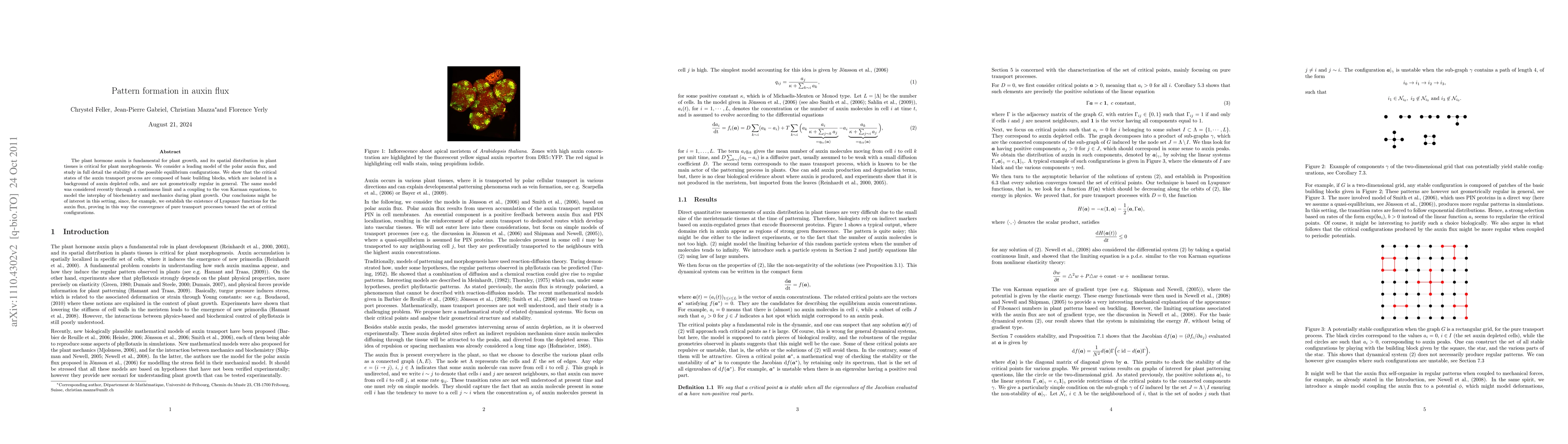 The plant hormone auxin is fundamental for plant growth, and its spatial distribution in plant tissues is critical for plant morphogenesis. We consider a leading model of the polar auxin flux, and study in full detail the stability of the possible equilibrium configurations. We show that the critical states of the auxin transport process are composed of basic building blocks, which are isolated in a background of auxin depleted cells, and are not geometrically regular in general. The same model was considered recently through a continuous limit and a coupling to the von Karman equations, to model the interplay of biochemistry and mechanics during plant growth. Our conclusions might be of interest in this setting, since, for example, we establish the existence of Lyapunov functions for the auxin flux, proving in this way the convergence of pure transport processes toward the set of critical configurations.