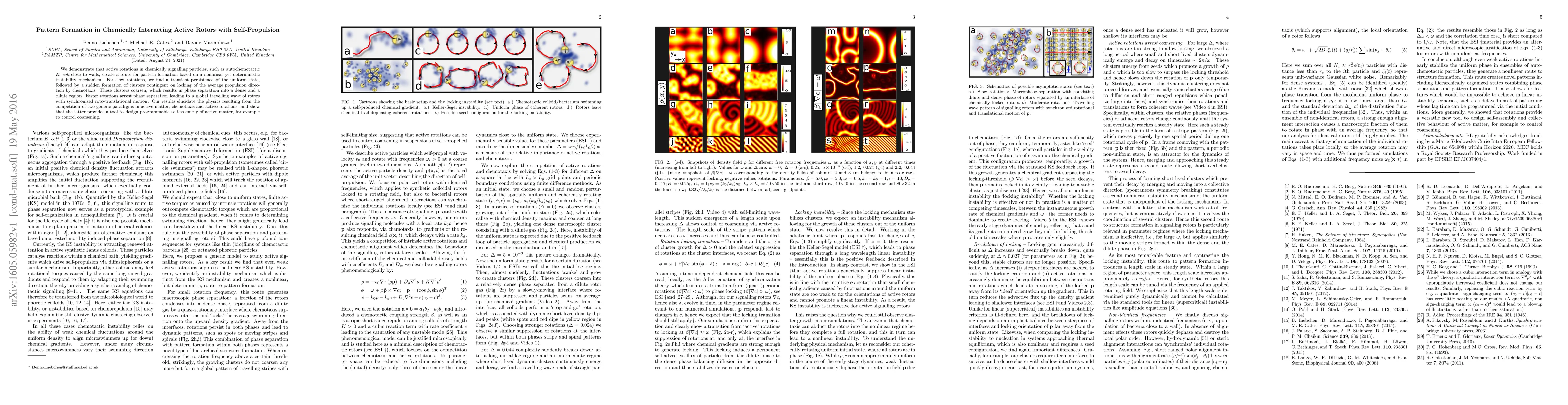 We demonstrate that active rotations in chemically signalling particles, such as autochemotactic {\it E. coli} close to walls, create a route for pattern formation based on a nonlinear yet deterministic instability mechanism. For slow rotations, we find a transient persistence of the uniform state, followed by a sudden formation of clusters contingent on locking of the average propulsion direction by chemotaxis. These clusters coarsen, which results in phase separation into a dense and a dilute region. Faster rotations arrest phase separation leading to a global travelling wave of rotors with synchronized roto-translational motion. Our results elucidate the physics resulting from the competition of two generic paradigms in active matter, chemotaxis and active rotations, and show that the latter provides a tool to design programmable self-assembly of active matter, for example to control coarsening.