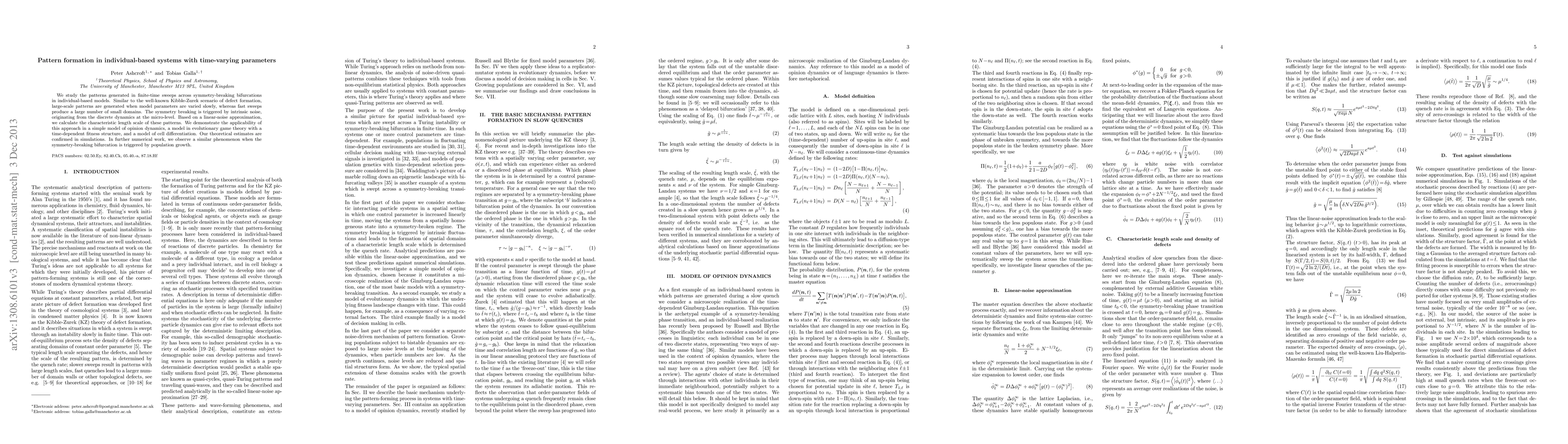 We study the patterns generated in finite-time sweeps across symmetry-breaking bifurcations in individual-based models. Similar to the well-known Kibble-Zurek scenario of defect formation, large-scale patterns are generated when model parameters are varied slowly, whereas fast sweeps produce a large number of small domains. The symmetry breaking is triggered by intrinsic noise, originating from the discrete dynamics at the micro-level. Based on a linear-noise approximation, we calculate the characteristic length scale of these patterns. We demonstrate the applicability of this approach in a simple model of opinion dynamics, a model in evolutionary game theory with a time-dependent fitness structure, and a model of cell differentiation. Our theoretical estimates are confirmed in simulations. In further numerical work, we observe a similar phenomenon when the symmetry-breaking bifurcation is triggered by population growth.