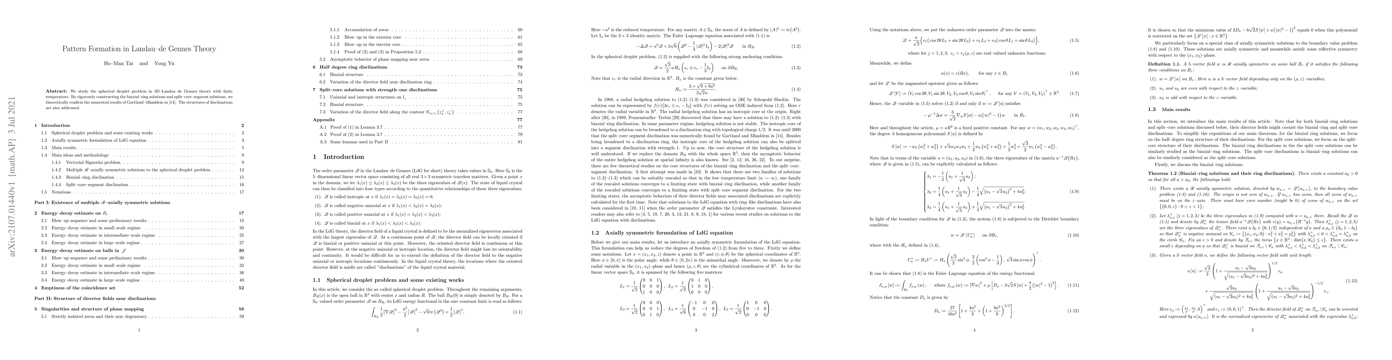 We study the spherical droplet problem in 3D-Landau de Gennes theory with finite temperature. By rigorously constructing the biaxial-ring solutions and split-core-segment solutions, we theoretically confirm the numerical results of Gartland-Mkaddem in [14]. The structures of disclinations are also addressed.