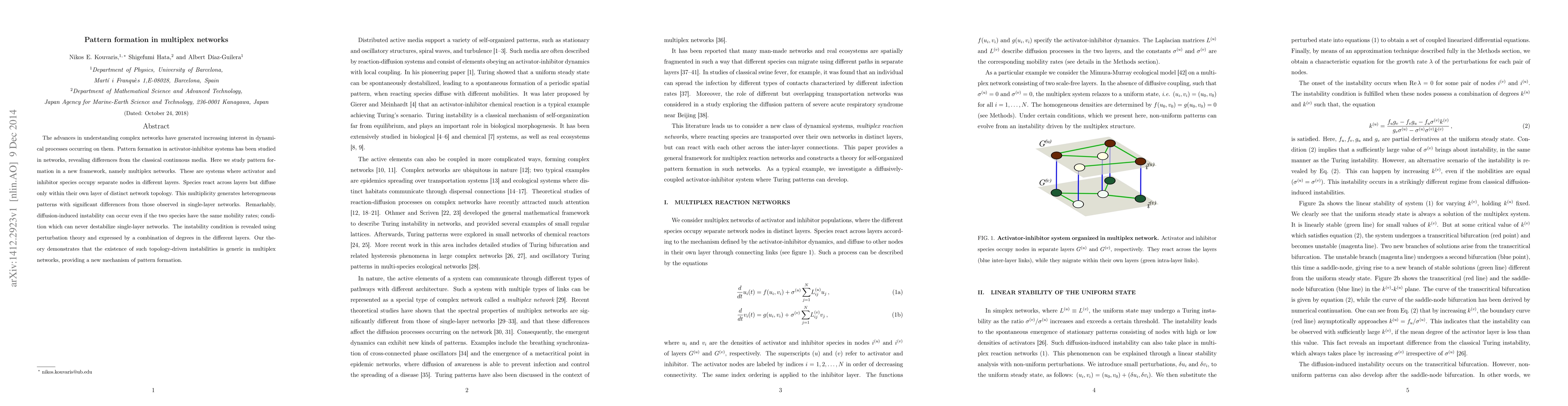 This paper investigates pattern formation in multiplex networks, where activator and inhibitor species occupy distinct layers, revealing that diffusion-induced instability can occur even with equal mobility rates, unlike single-layer networks. The study uses perturbation theory to show that topology-driven instabilities are generic in such networks, offering a new mechanism for pattern formation.