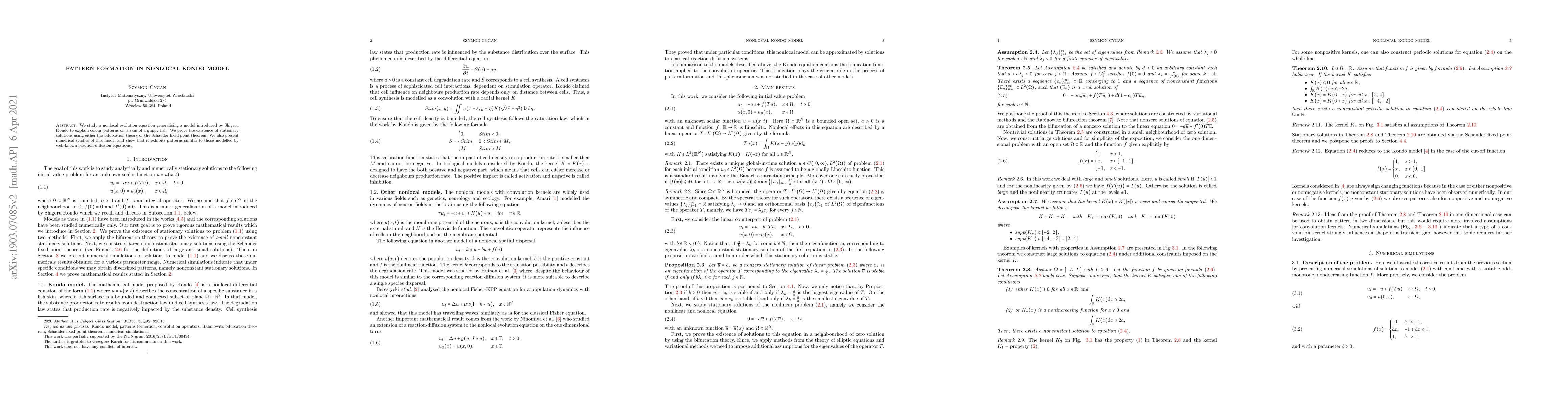 Researchers studied a nonlocal Kondo model to understand color patterns on fish skin, proving stationary solutions exist through bifurcation theory or Schauder fixed point theorem, and showing numerical results similar to reaction-diffusion equations.