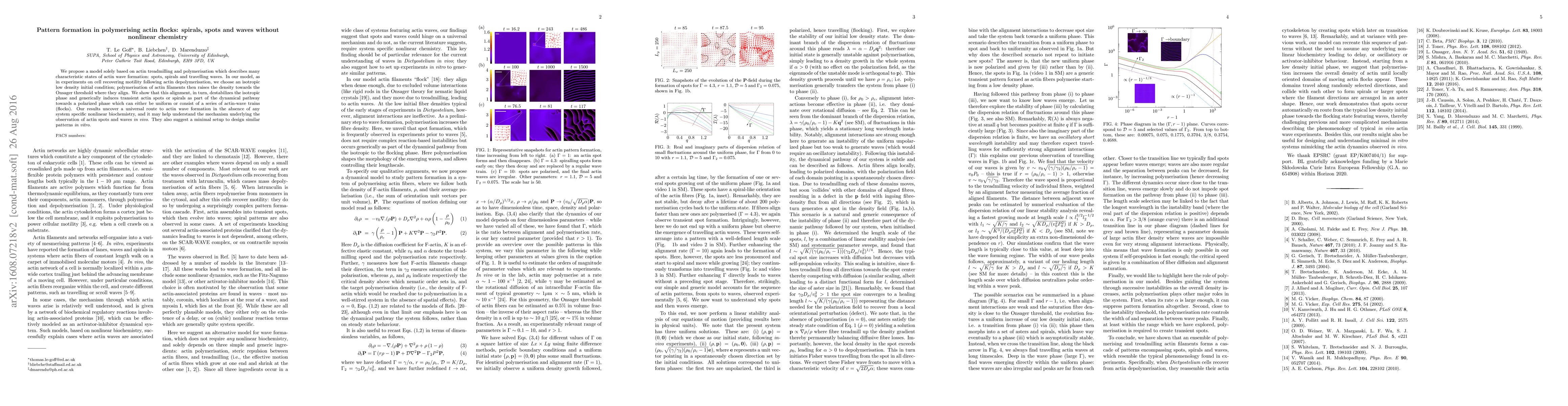 This paper proposes a model based on actin treadmilling and polymerization that explains the formation of actin spots, spirals, and waves without requiring nonlinear chemistry. The model demonstrates how actin density alignment destabilizes the isotropic phase, leading to transient patterns as the system transitions to a polarized state.