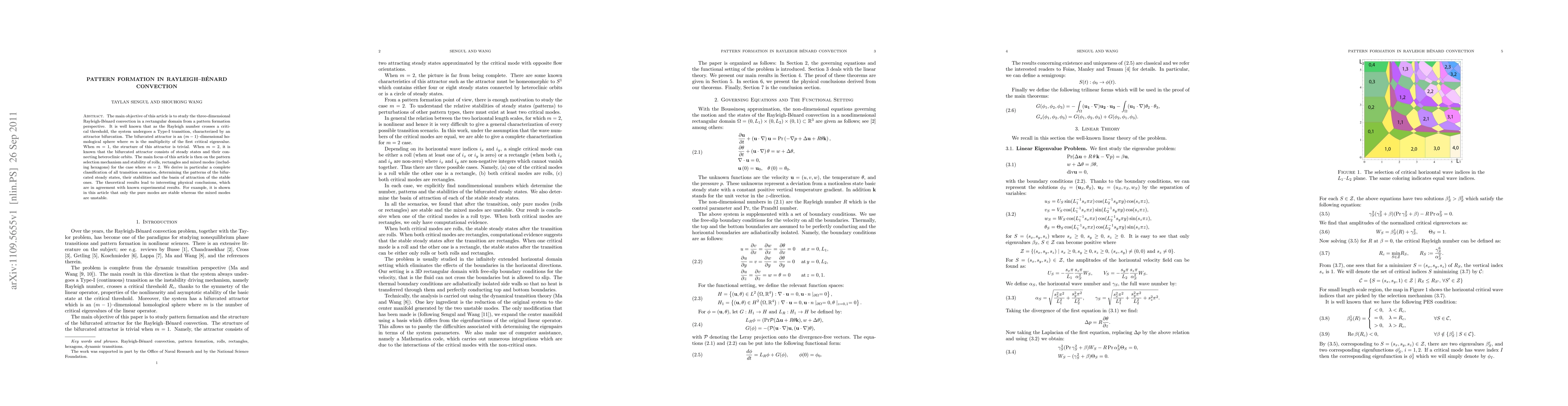 The study employs a theoretical analysis of Rayleigh-Benard convection, focusing on pattern formation through bifurcation theory and dynamical systems.