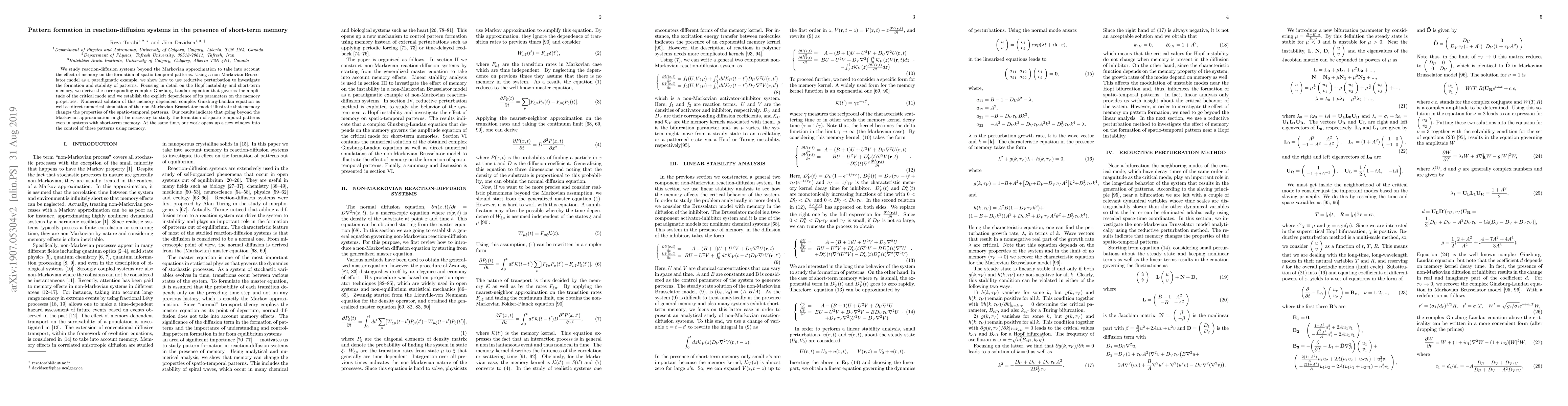 This paper investigates reaction-diffusion systems with short-term memory effects, using a non-Markovian Brusselator model and reductive perturbation. It reveals that memory alters spatio-temporal pattern formation, necessitating a departure from the Markovian approximation for accurate studies.