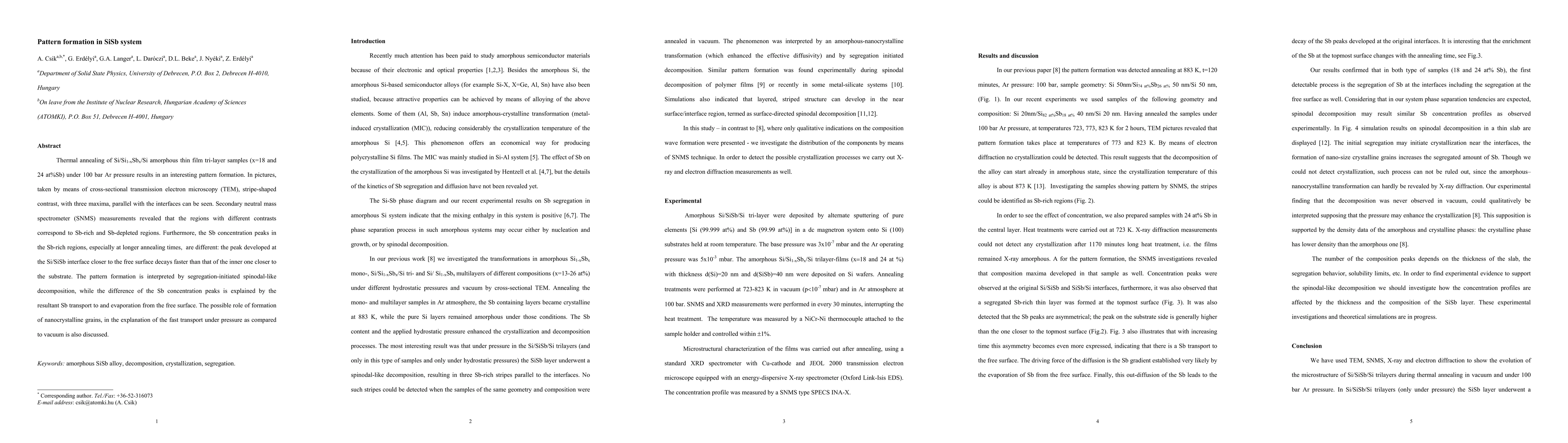 Researchers investigated the pattern formation in a SiSb system after thermal annealing under pressure, finding stripe-shaped contrasts with Sb-rich and depleted regions, which they attributed to segregation-initiated spinodal-like decomposition.