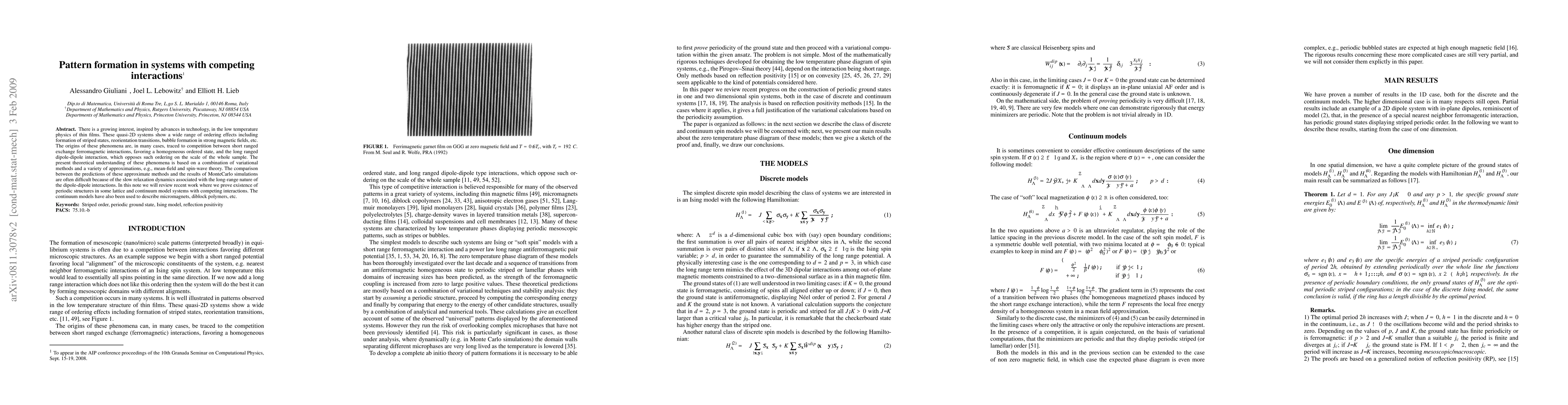 There is a growing interest, inspired by advances in technology, in the low temperature physics of thin films. These quasi-2D systems show a wide range of ordering effects including formation of striped states, reorientation transitions, bubble formation in strong magnetic fields, etc. The origins of these phenomena are, in many cases, traced to competition between short ranged exchange ferromagnetic interactions, favoring a homogeneous ordered state, and the long ranged dipole-dipole interaction, which opposes such ordering on the scale of the whole sample. The present theoretical understanding of these phenomena is based on a combination of variational methods and a variety of approximations, e.g., mean-field and spin-wave theory. The comparison between the predictions of these approximate methods and the results of MonteCarlo simulations are often difficult because of the slow relaxation dynamics associated with the long-range nature of the dipole-dipole interactions. In this note we will review recent work where we prove existence of periodic structures in some lattice and continuum model systems with competing interactions. The continuum models have also been used to describe micromagnets, diblock polymers, etc.