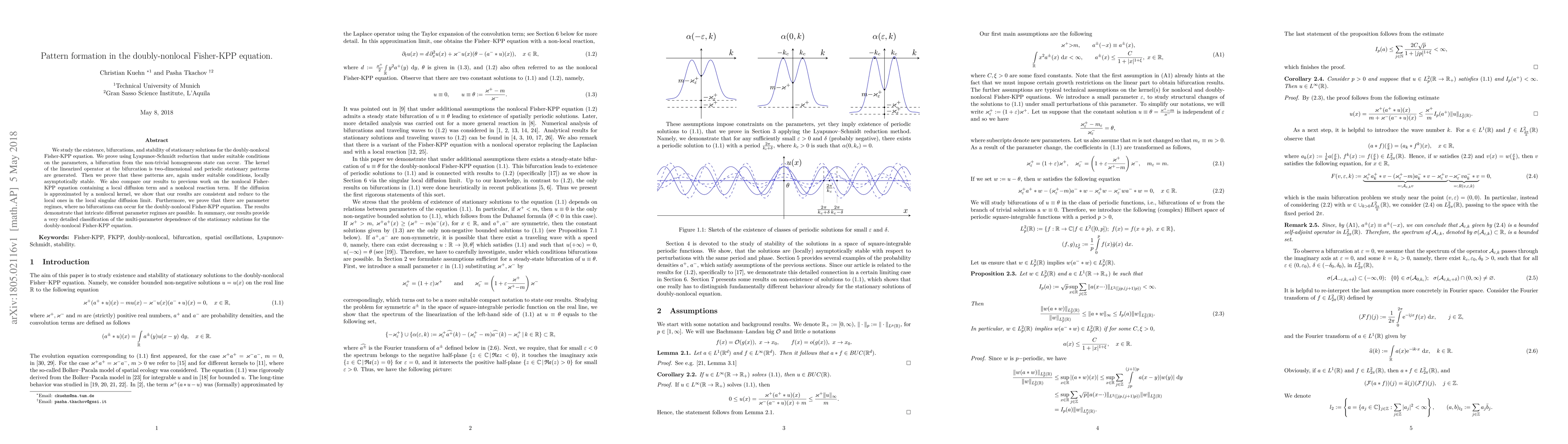 This paper explores the bifurcation and stability of stationary solutions in the doubly-nonlocal Fisher-KPP equation, demonstrating that under specific parameter conditions, periodic patterns can emerge and are locally asymptotically stable. The study also highlights parameter regimes where no bifurcations occur, providing a comprehensive classification of the equation's multi-parameter behavior.