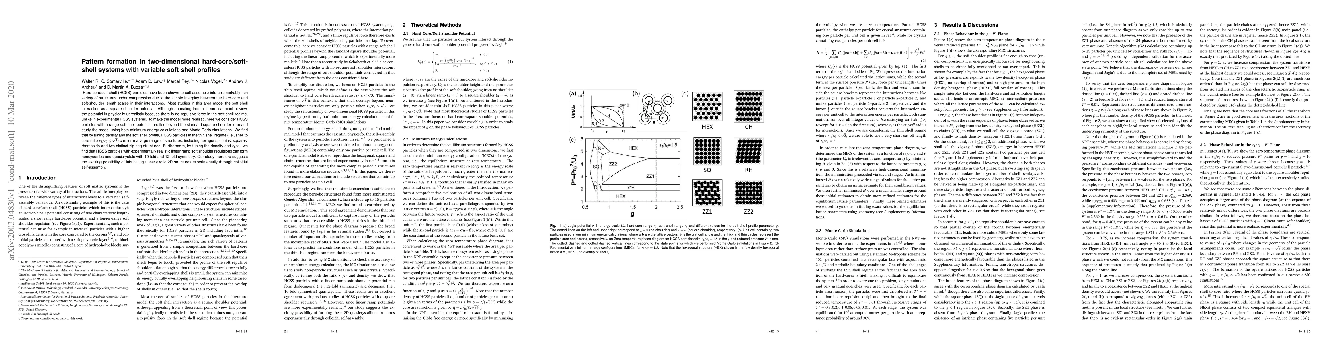 Hard-core/soft shell (HCSS) particles have been shown to self-assemble into a remarkably rich variety of structures under compression due to the simple interplay between the hard-core and soft-shoulder length scales in their interactions. Most studies in this area model the soft shell interaction as a square shoulder potential. Although appealing from a theoretical point of view, the potential is physically unrealistic because there is no repulsive force in the soft shell regime, unlike in experimental HCSS systems. To make the model more realistic, here we consider HCSS particles with a range soft shell potential profiles beyond the standard square shoulder form and study the model using both minimum energy calculations and Monte Carlo simulations. We find that by tuning density and the soft shell profile, HCSS particles in the thin shell regime (i.e., shell to core ratio $r_1/r_0 \leq \sqrt{3}$) can form a large range of structures, including hexagons, chains, squares, rhomboids and two distinct zig-zag structures. Furthermore, by tuning the density and $r_1/r_0$, we find that HCSS particles with experimentally realistic linear ramp soft shoulder repulsions can form honeycombs and quasicrystals with 10-fold and 12-fold symmetry. Our study therefore suggests the exciting possibility of fabricating these exotic 2D structures experimentally through colloidal self-assembly.