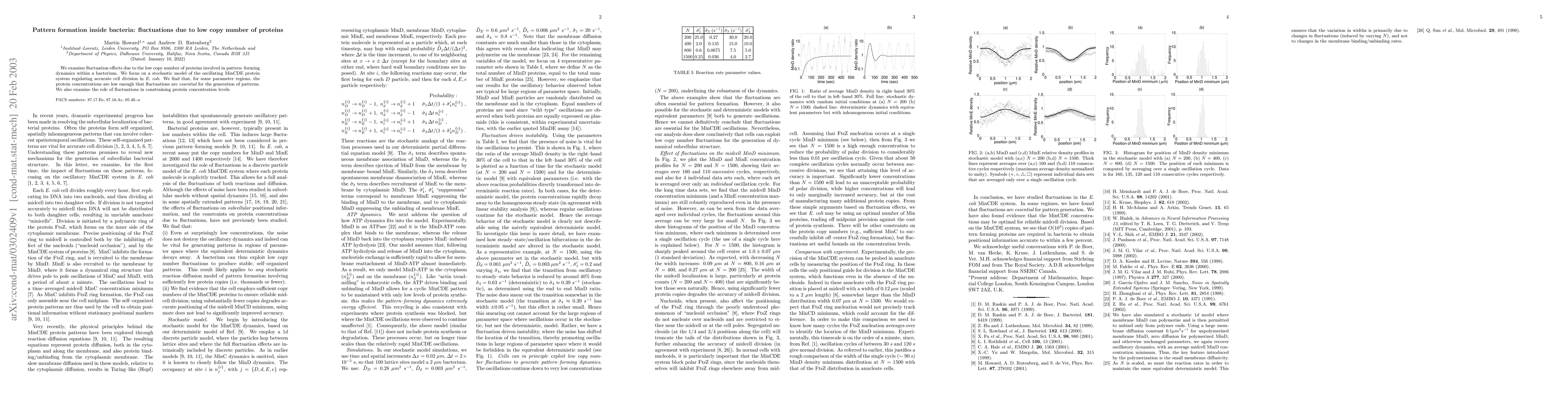 We examine fluctuation effects due to the low copy number of proteins involved in pattern-forming dynamics within a bacterium. We focus on a stochastic model of the oscillating MinCDE protein system regulating accurate cell division in E. coli. We find that, for some parameter regions, the protein concentrations are low enough that fluctuations are essential for the generation of patterns. We also examine the role of fluctuations in constraining protein concentration levels.