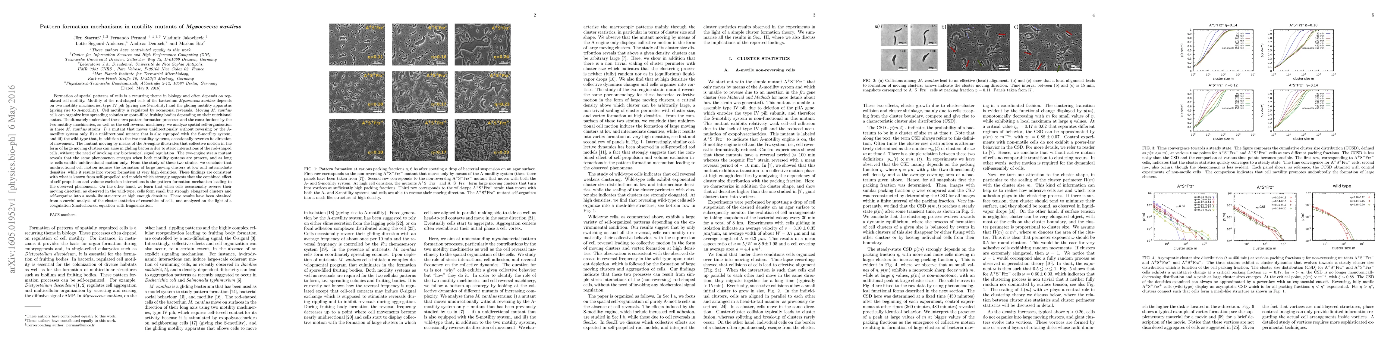 Formation of spatial patterns of cells is a recurring theme in biology and often depends on regulated cell motility. Motility of M. xanthus depends on two motility machineries: the S-engine and A-engine. Moving M. xanthus cells can organize into spreading colonies or spore-filled fruiting bodies depending on their nutritional status. To understand these two pattern formation processes and the contributions by the two motility machineries, as well as cell reversal, we analyze spatial self-organization in 3 strains: i) a mutant that moves unidirectionally without reversing by the A-motility system only, ii) a unidirectional mutant that is also equipped with the S-motility system, and iii) the wild-type that, in addition to the two motility systems, reverses its direction of movement. The mutant moving by the A-engine illustrates that collective motion in the form of large moving clusters can arise in gliding bacteria due to steric interactions of the rod-shaped cells, without the need of invoking any biochemical signal regulation. The two-engine strain mutant reveals that the same phenomenon emerges when both motility systems are present, and as long as cells exhibit unidirectional motion only. From the study of these two strains, we conclude that unidirectional cell motion induces the formation of large moving clusters at low and intermediate densities, while it results into vortex formation at very high densities. These findings are consistent with what is known from self-propelled rods which strongly suggests that the combined effect of self-propulsion and volume exclusion interactions is the pattern formation mechanism leading to the observed phenomena. In addition, we learn that when cells reverse, as observed in the wild-type, cells form small but strongly elongated clusters and self-organize into a mesh-like structure at high enough densities.