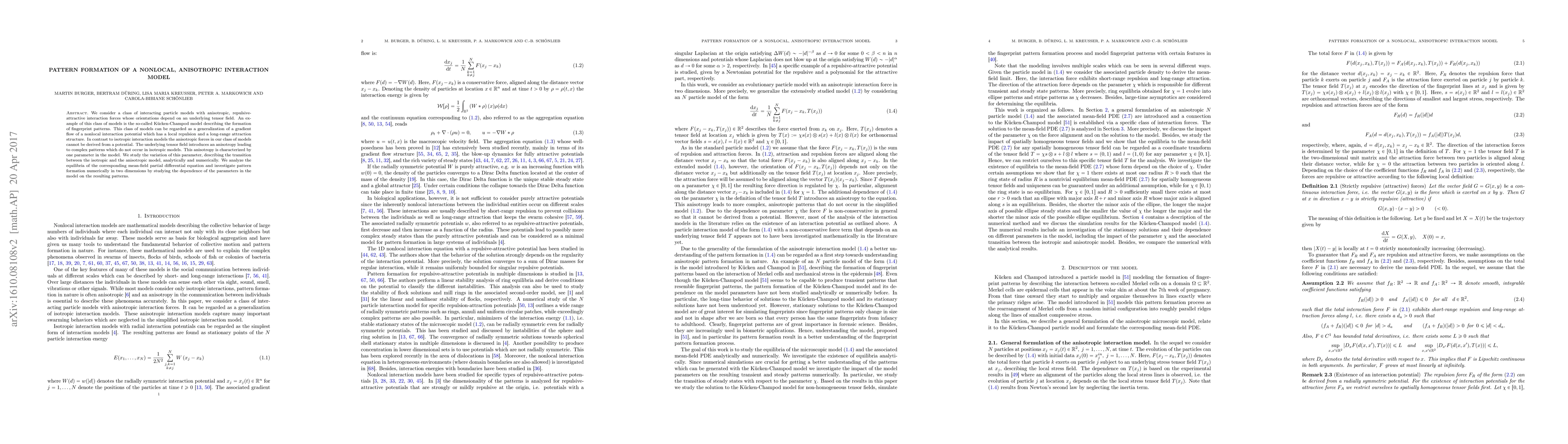 This paper explores a nonlocal, anisotropic interaction model for particle systems, exemplified by the Kücken-Champod model for fingerprint patterns. It investigates how varying a single anisotropy parameter transitions between isotropic and anisotropic behaviors, analyzing equilibria and numerically studying pattern formation in two dimensions.