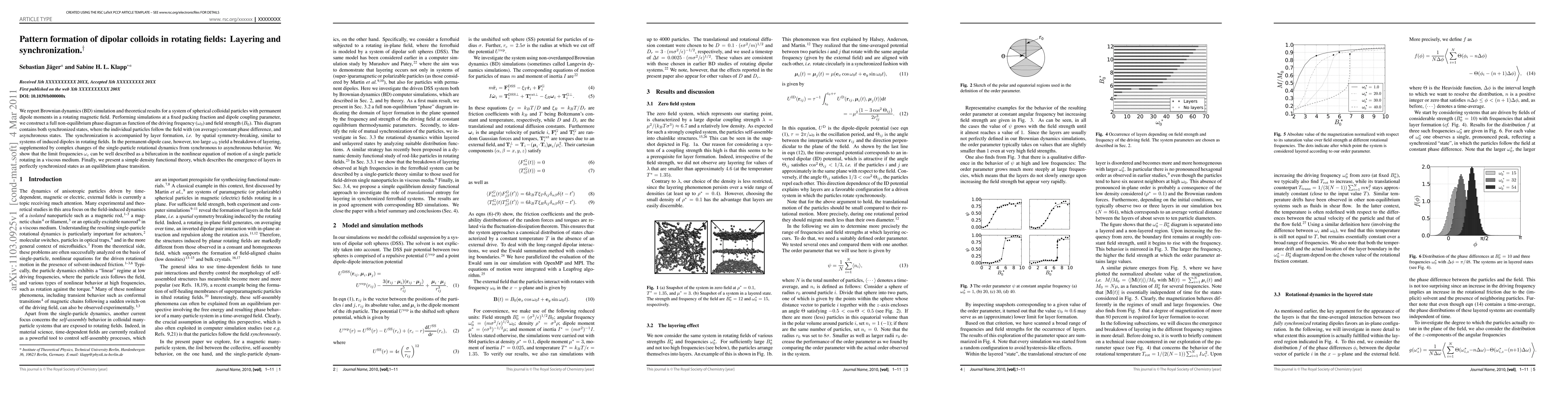 This research uses Brownian dynamics simulations and theory to study spherical colloidal particles with permanent dipole moments in a rotating magnetic field. The study reveals a phase diagram with synchronized and asynchronous states, accompanied by layer formation. Large field rotation frequencies can disrupt layering, and the limit frequencies are described as bifurcations in a single particle's rotational motion. A density functional theory explains layer emergence in perfectly synchronized states as an equilibrium phase transition.