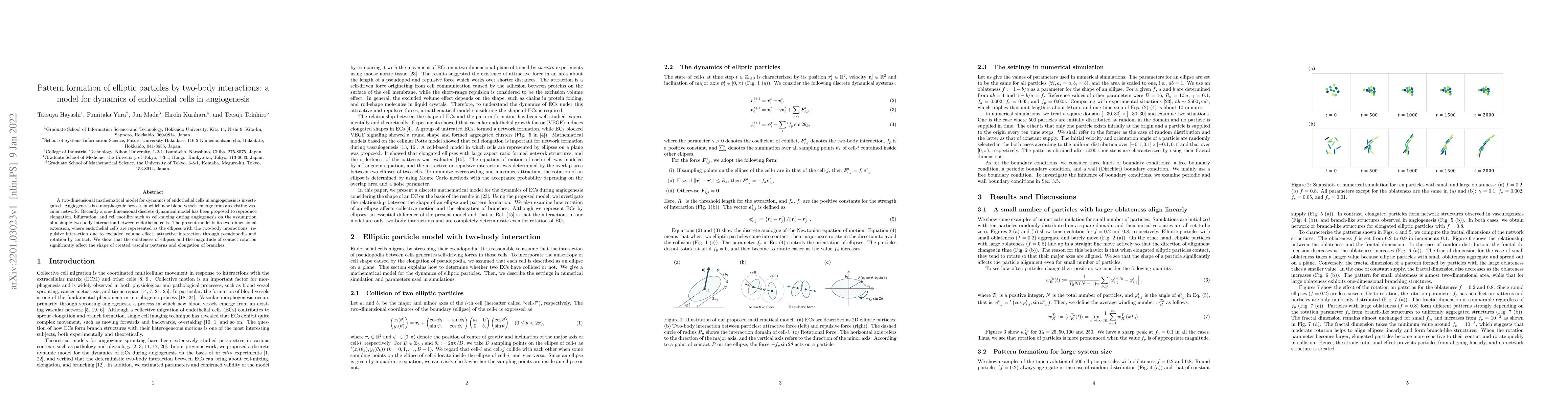 This paper extends a one-dimensional model to two dimensions, representing endothelial cells as elliptic particles with two-body interactions, to study angiogenesis. The model's results show that the shape and rotation of the cells significantly influence the formation and elongation of vascular patterns.