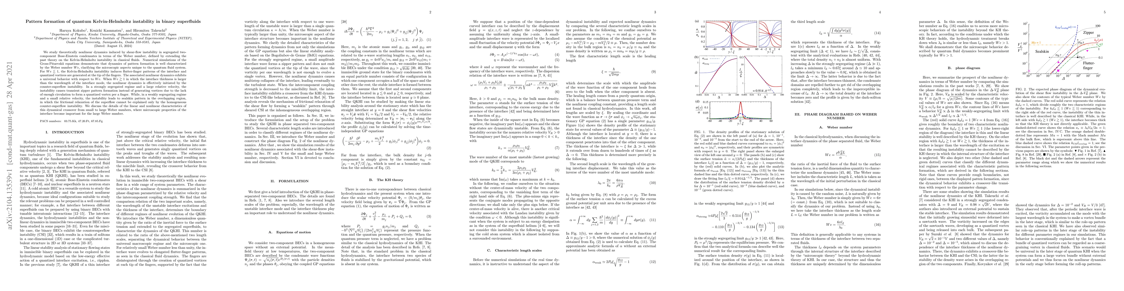 This paper investigates the nonlinear dynamics of quantum Kelvin-Helmholtz instability in binary superfluids through the Weber number, revealing pattern formation characterized by flutter-finger and quantized vortices for low Weber numbers. For high Weber numbers, it identifies a crossover to counter-superflow instability leading to transient zipper or sealskin patterns, emphasizing the role of interface thickness and segregation strength.