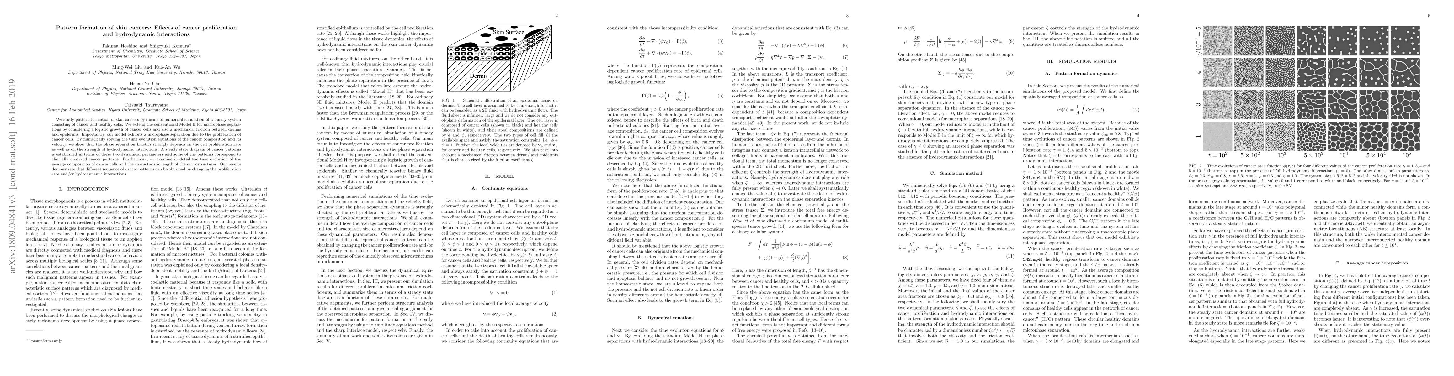 This research numerically simulates skin cancer pattern formation using an extended Model H, incorporating cancer cell proliferation and hydrodynamic interactions. The study reveals that pattern kinetics depend on cancer growth rates and interaction strength, leading to a steady state diagram correlating these parameters with clinically observed cancer patterns.