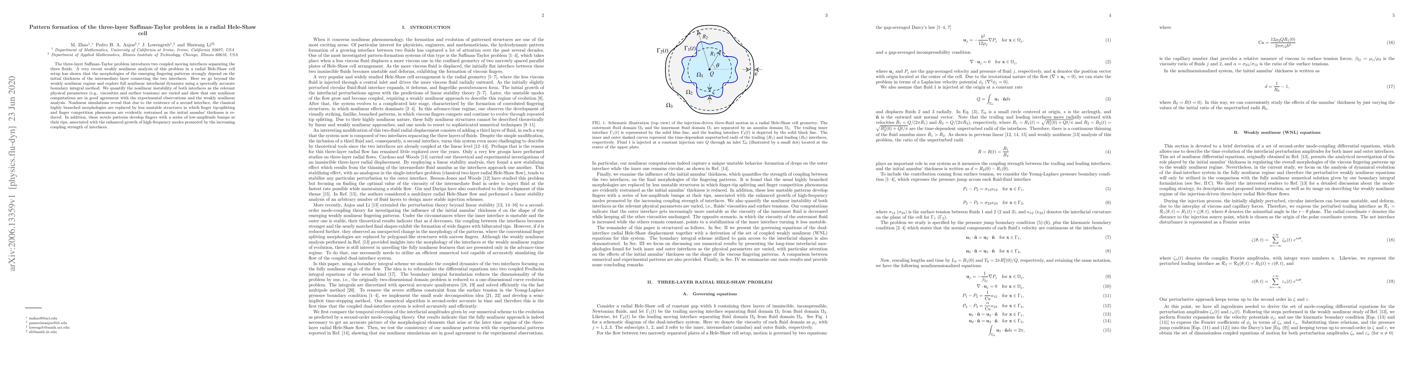 This paper investigates the nonlinear dynamics of the three-layer Saffman-Taylor problem in a radial Hele-Shaw cell, revealing that fingering patterns depend on the initial thickness of the intermediate layer. Nonlinear simulations show that the presence of a second interface leads to less unstable structures with restrained finger tip-splitting and competition, and enhanced growth of high-frequency modes.