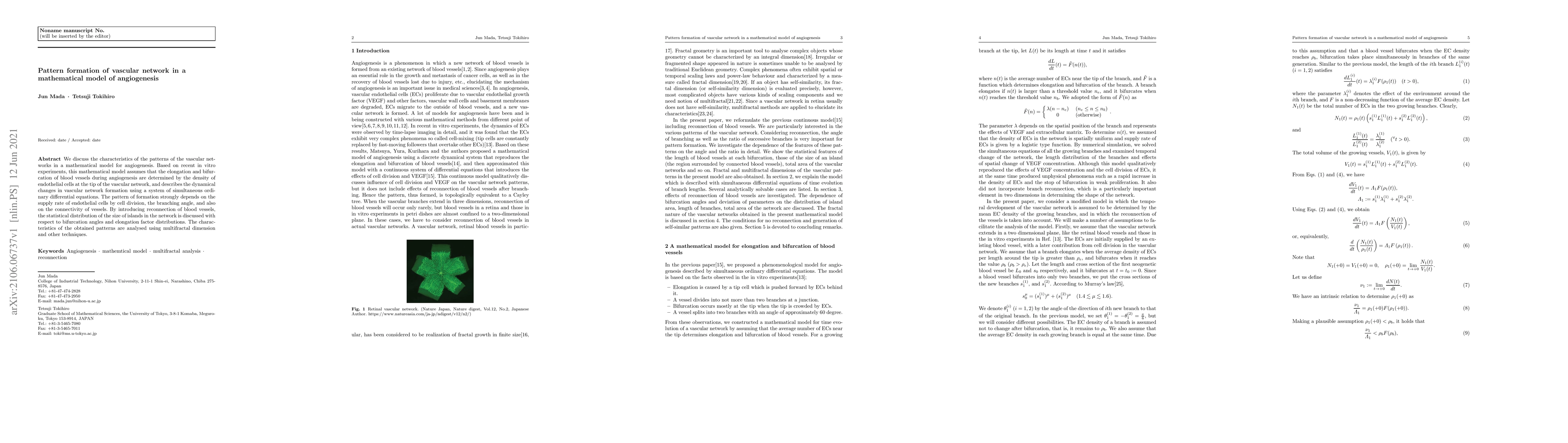 This paper presents a mathematical model of angiogenesis that simulates the formation of vascular networks through endothelial cell dynamics, focusing on the effects of cell division rates, branching angles, and vessel connectivity. The model incorporates reconnections and analyzes the resulting patterns using multifractal dimension and other analytical techniques.